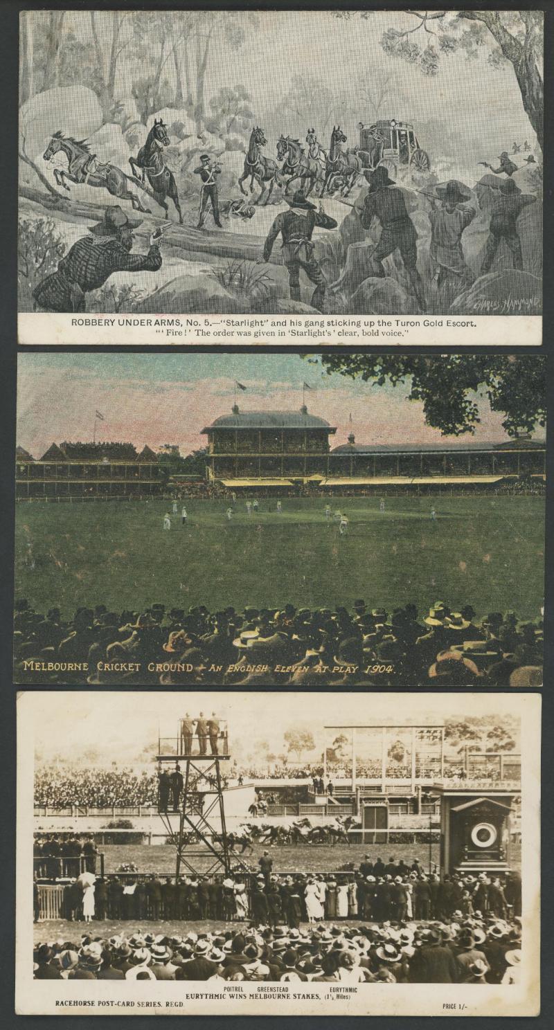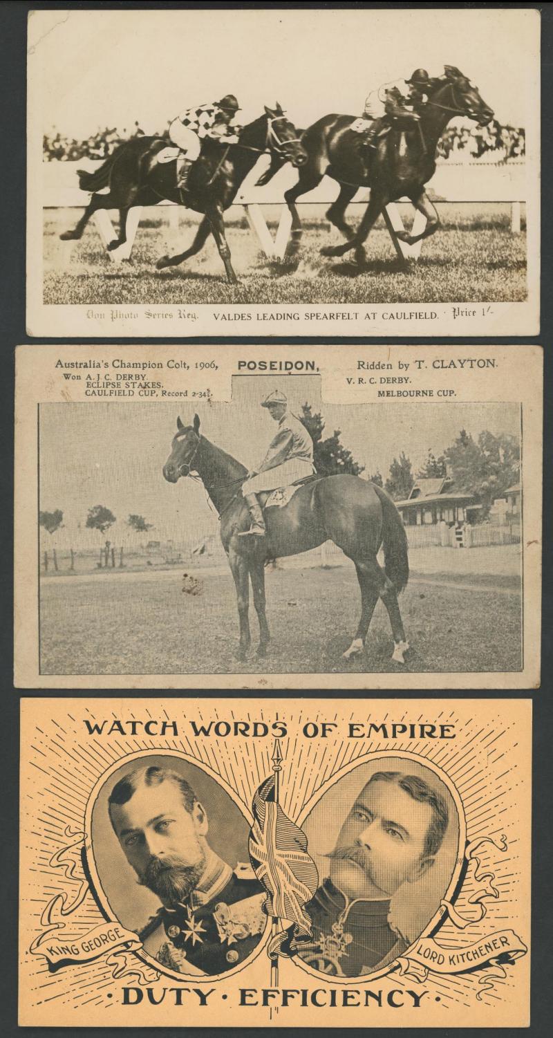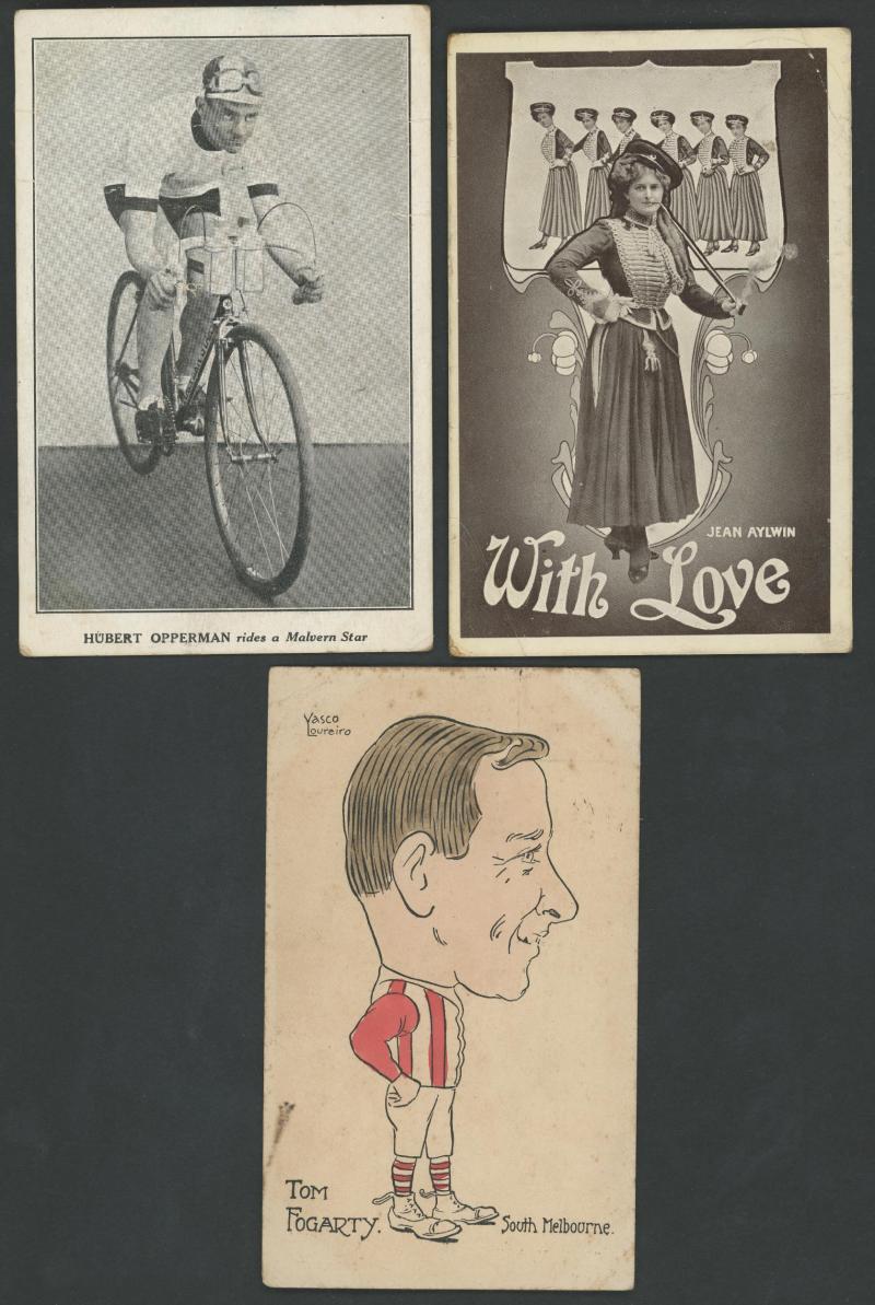 Actresses & Actors x44, Kookaburra WWI Patriotics x4 (superb), Champion Swimmer Annette Kellermann x5, artist cards including Bushrangers, Sporting mostly photo-mechanical cards for Horseracing x8, Cricket x2, Aussie Rules x2 & Cycling (Hubert