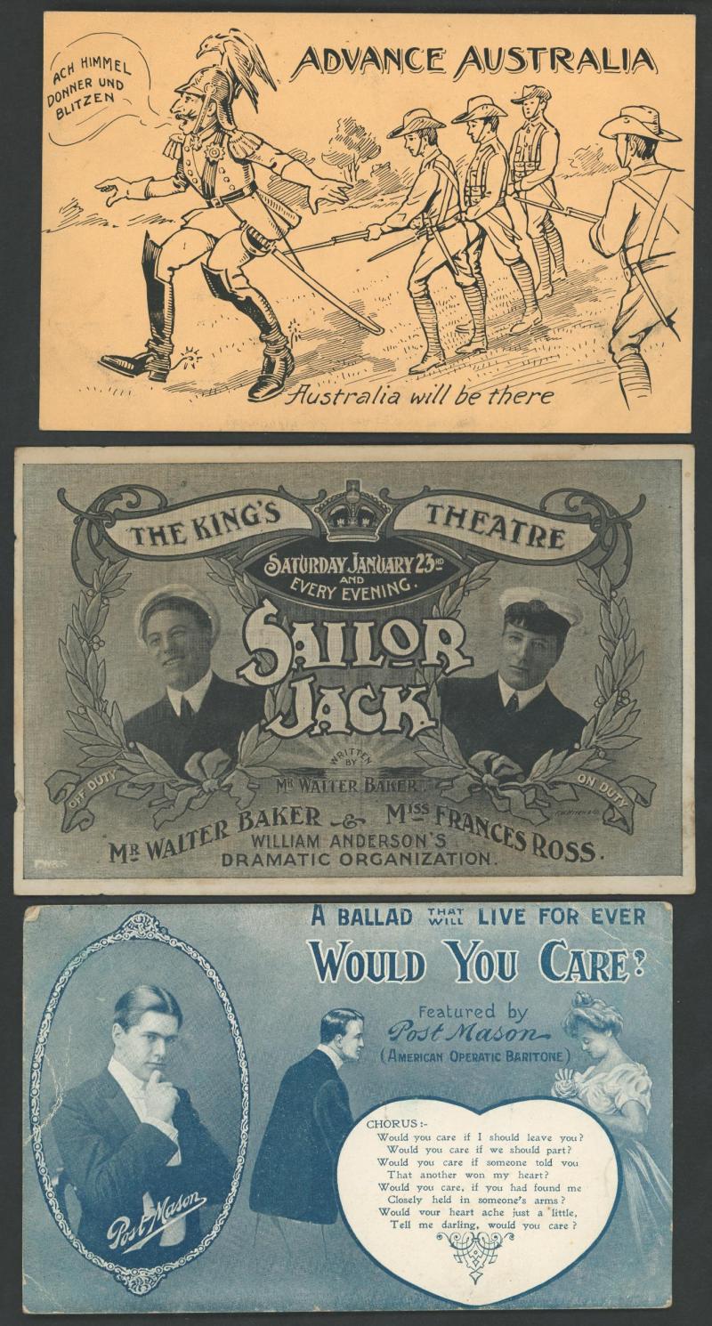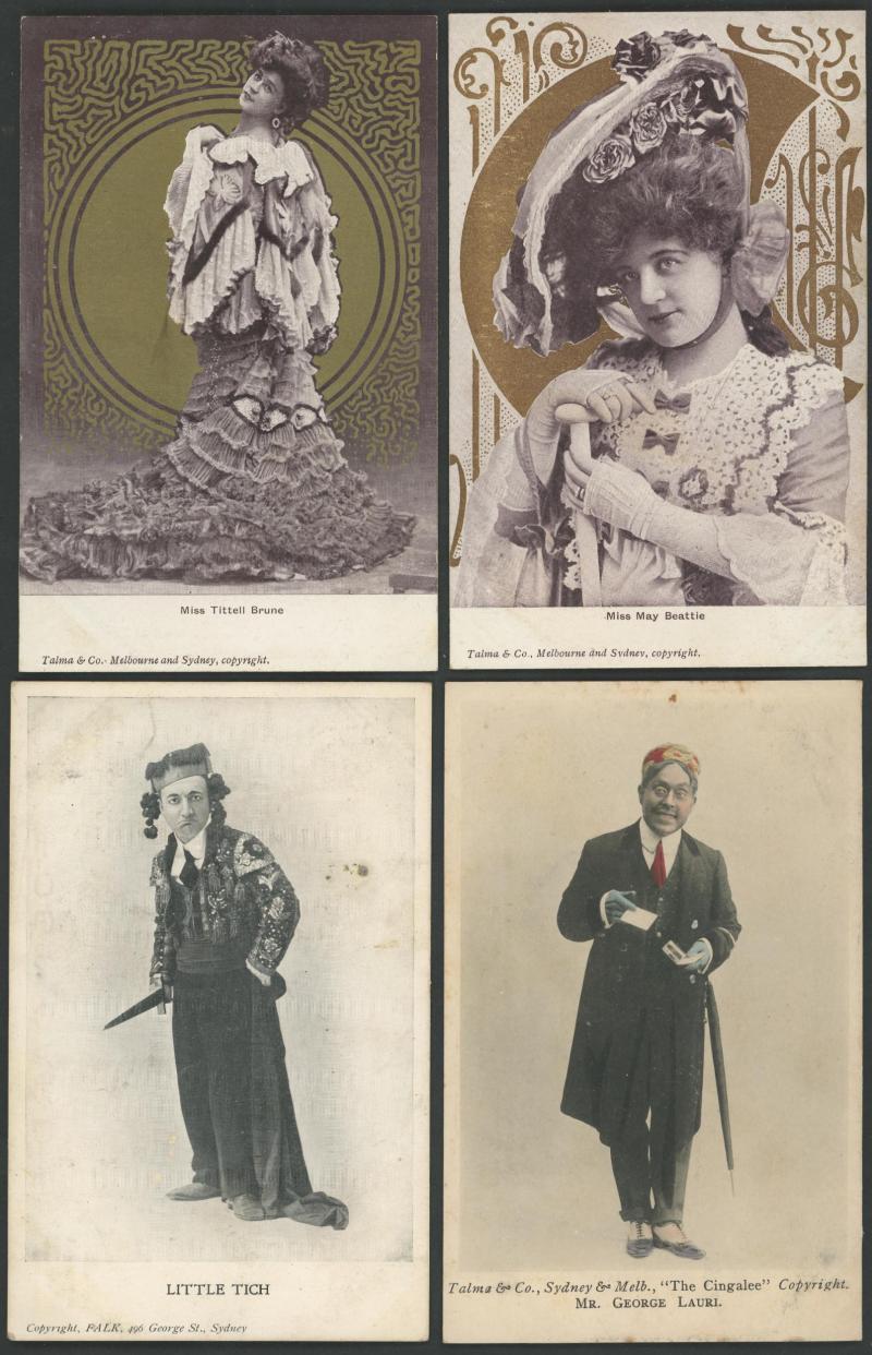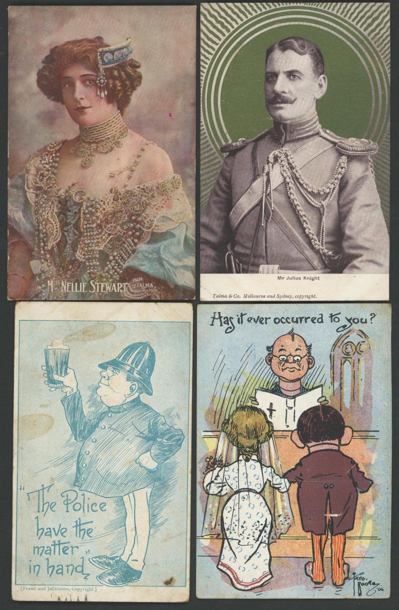 Actresses & Actors x44, Kookaburra WWI Patriotics x4 (superb), Champion Swimmer Annette Kellermann x5, artist cards including Bushrangers, Sporting mostly photo-mechanical cards for Horseracing x8, Cricket x2, Aussie Rules x2 & Cycling (Hubert