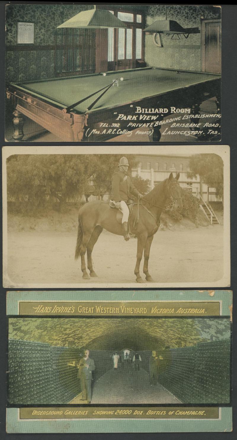 x140 including beautiful Nivens for R Crollick Fruit Merchants (Brisbane), Park View Billiard Room (Launceston) and Hans Irvine's Great Western Vineyard (Victoria); also a similar number of Australiana subjects including Rural Life, Talma & other