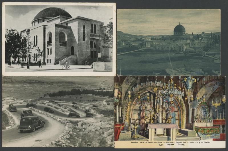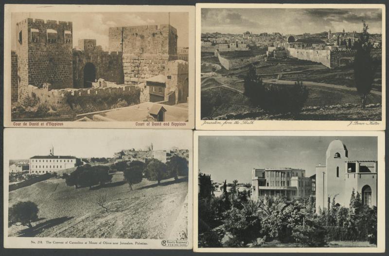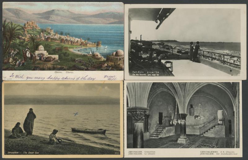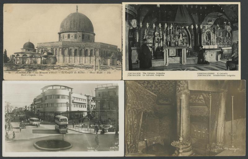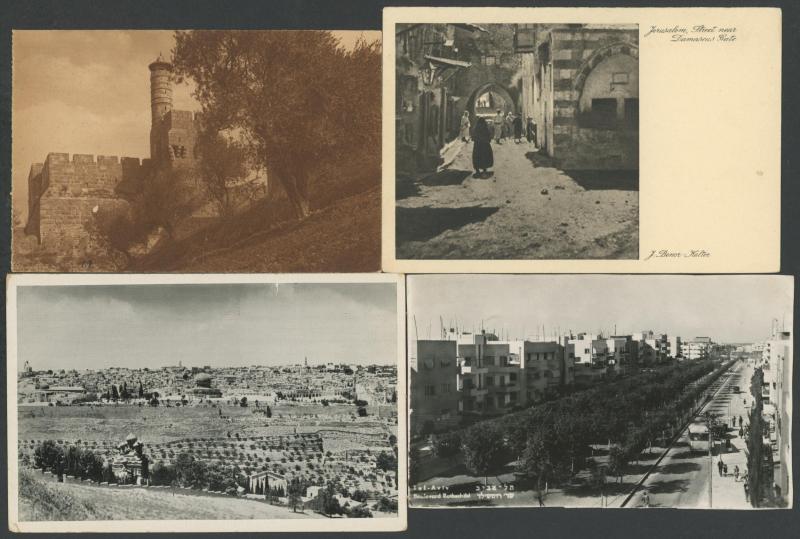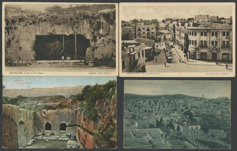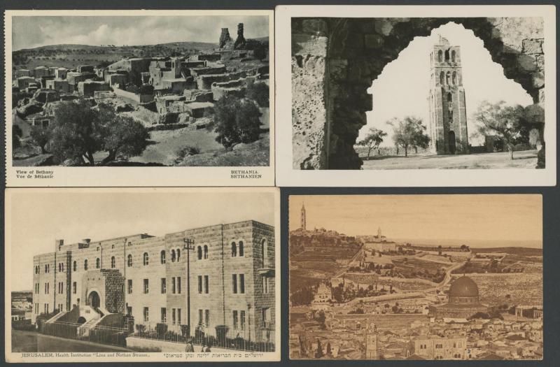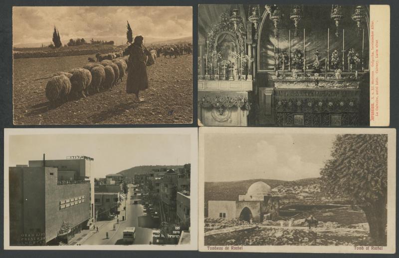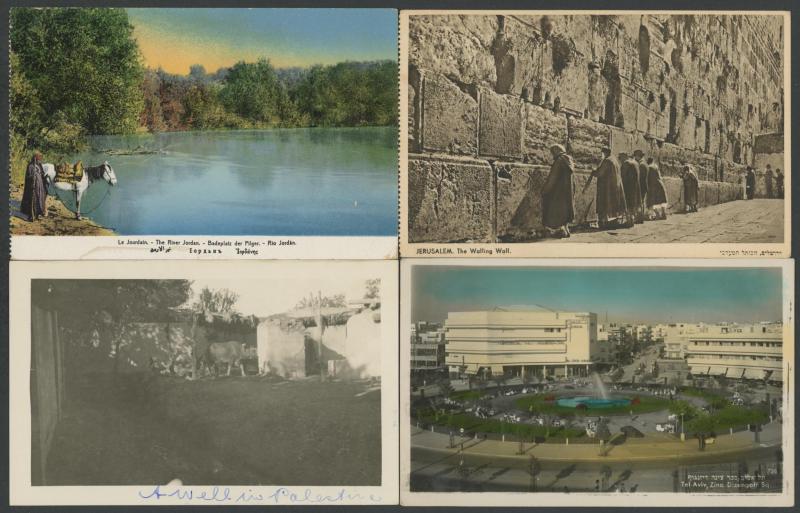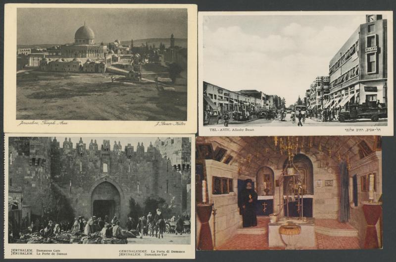 photo-mechanical types, with streetscapes, towns & villages, Arab, Christian & Jewish subjects including Ancient Sites, Kibbutzim, several artist cards, many with captions partly in Hebrew, an excellent Lot, generally very fine & mostly unused.