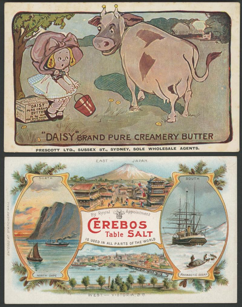 Spirit, Bonnington's Irish Moss x2, Cerebos Table Salt, Daisy Butter, Prescott Hams, Cobra Boot Polish, some minor blemishes but generally fine to very fine.