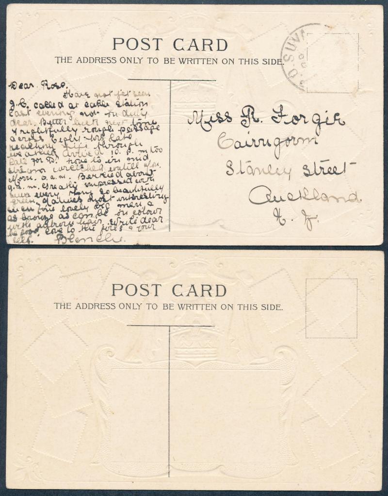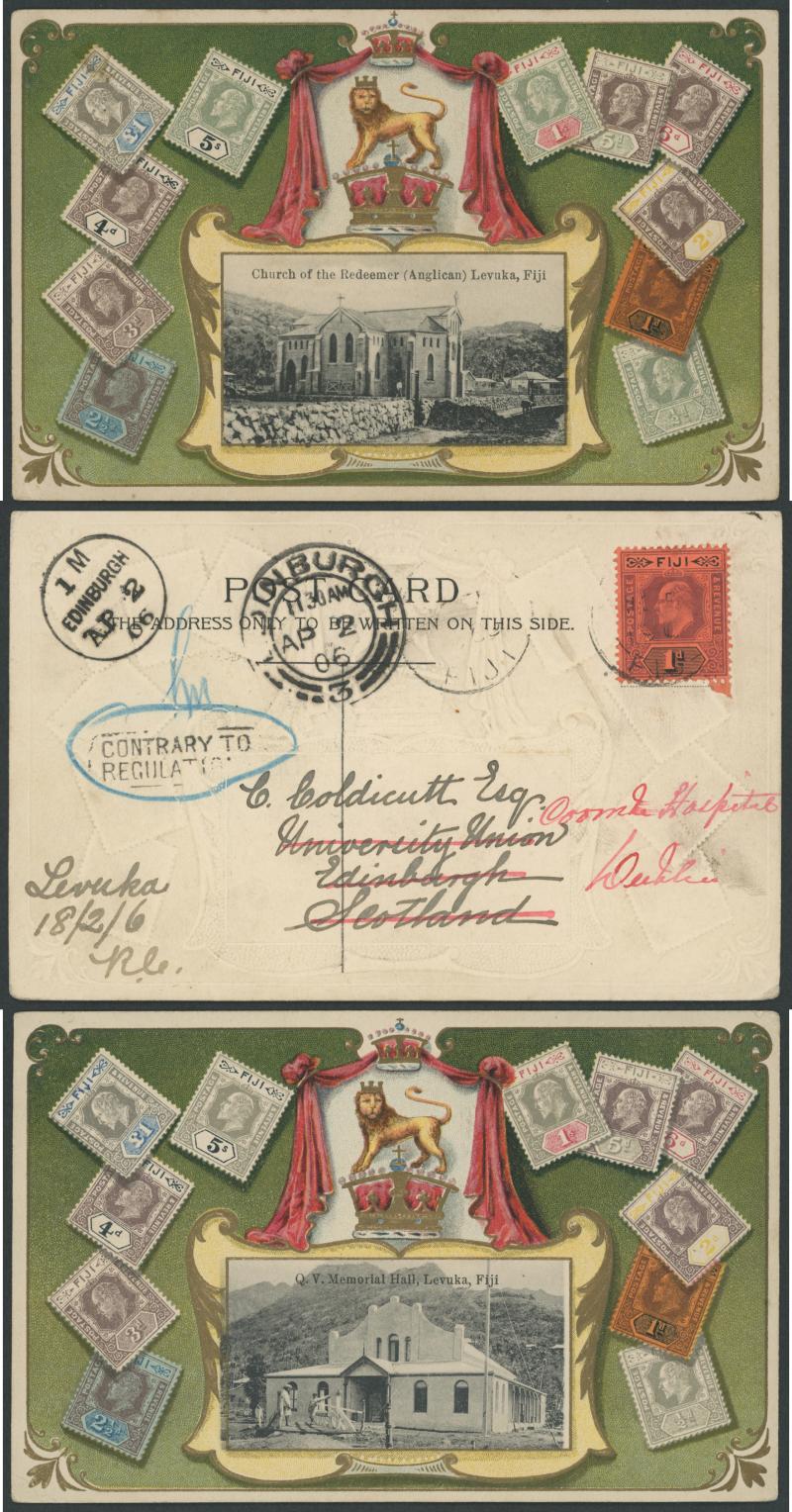 black/red tied by light Levuka cds redirected with Edinburgh transits and 'CONTRARY TO/REGULATIONS' boxed handstamp (presumably because the address was written across the Divided Back), 'Church of the Redeemer (Anglican), Levuka' used 1907 to Sydney