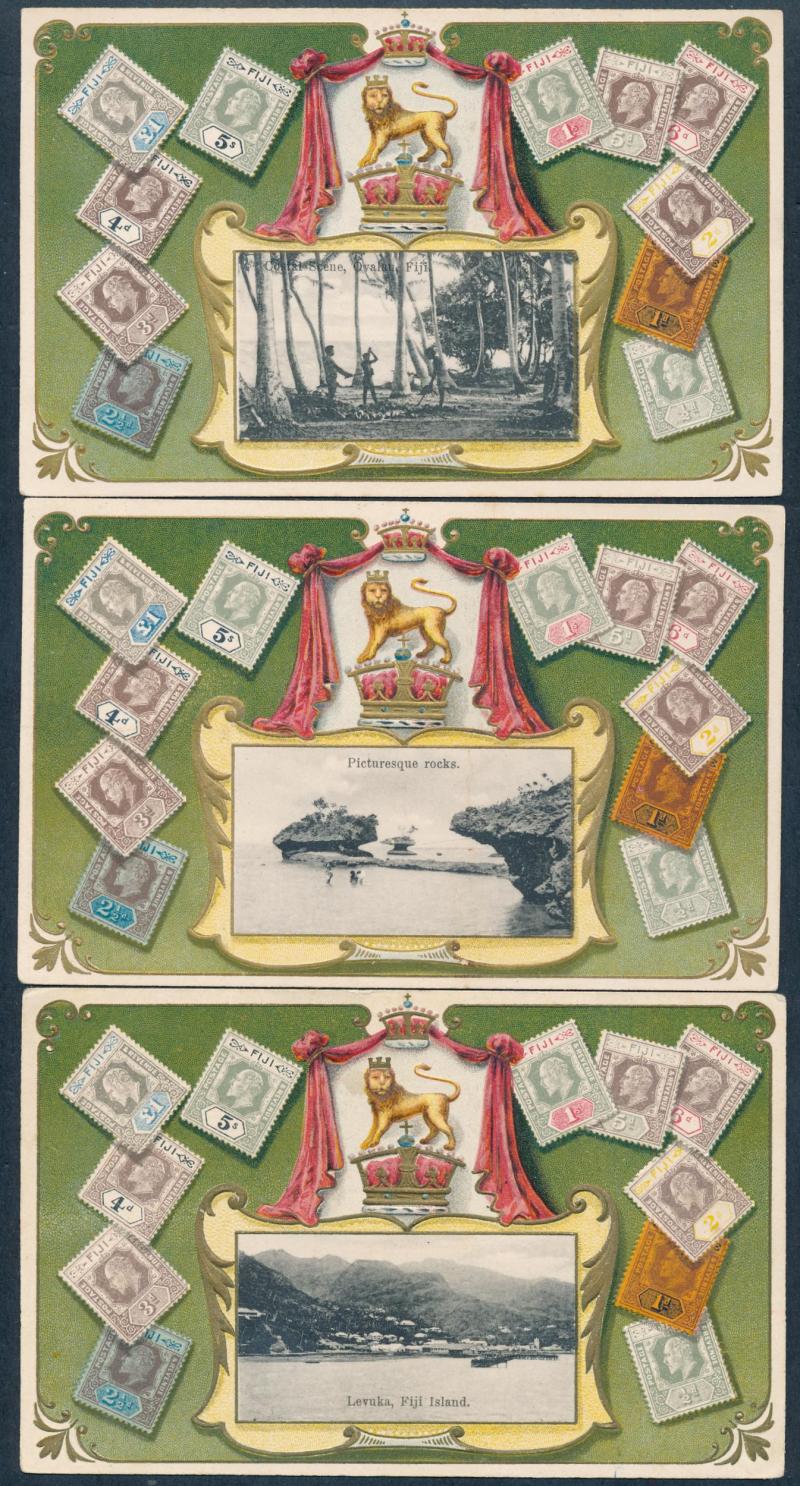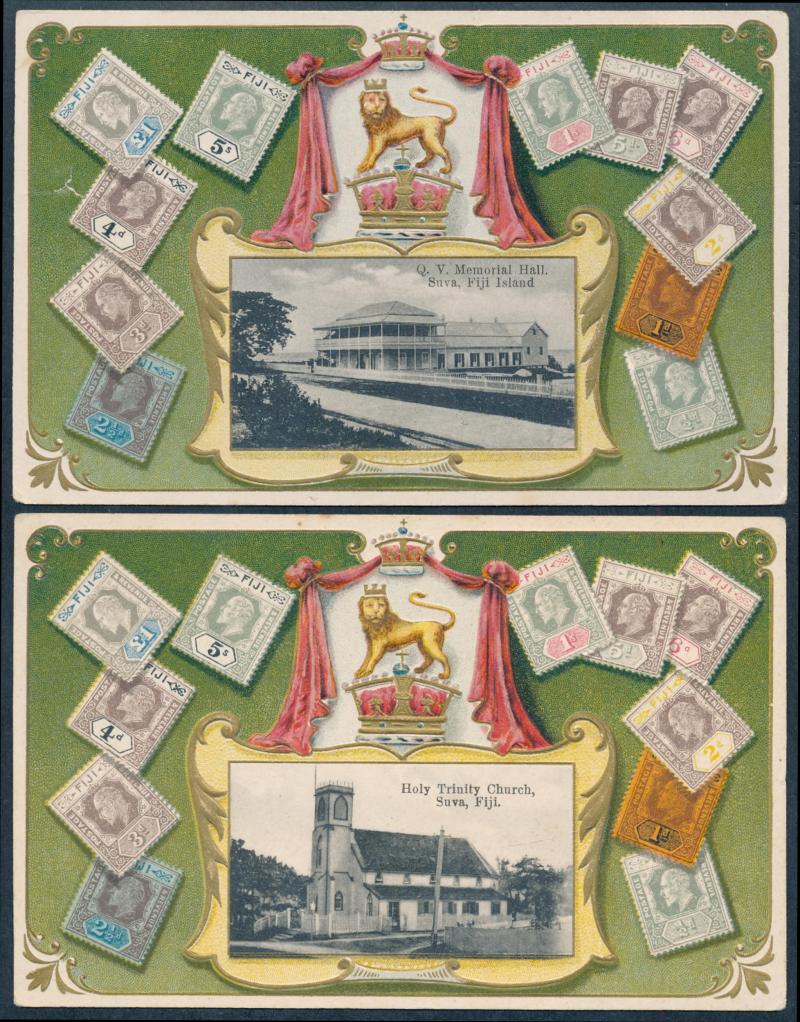 with KEVII 1d red tied by Suva cds, 'QV Memorial Hall, Suva' and 'Levuka' harbour both used to Australia with the stamps neatly removed, and unused 'Holy Trinity Church, Suva', 'QV Memorial Hall, Levuka', 'Picturesque Rocks' & 'Coastal Scene, Ovalau'