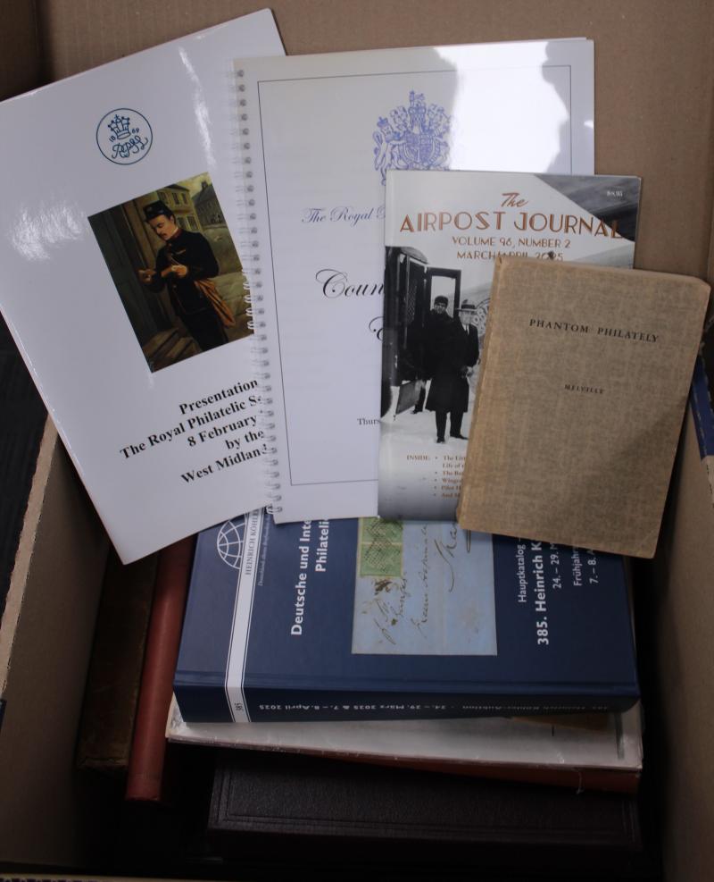 Carton with a focus on Postal History including Robson Lowe auction catalogues x47 from the 1960s to 1980s, many with prices