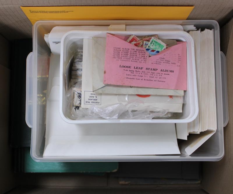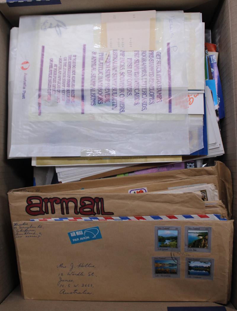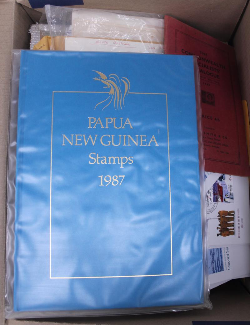 full sheets of 1937 Coronation Cinderella in both purple and brown, New Zealand QV stamps with Advertisements and lots of 1d Universals, some commercial and philatelic mail, PNG Yearbook, floor sweepings and general remainders. Priced to sell as it