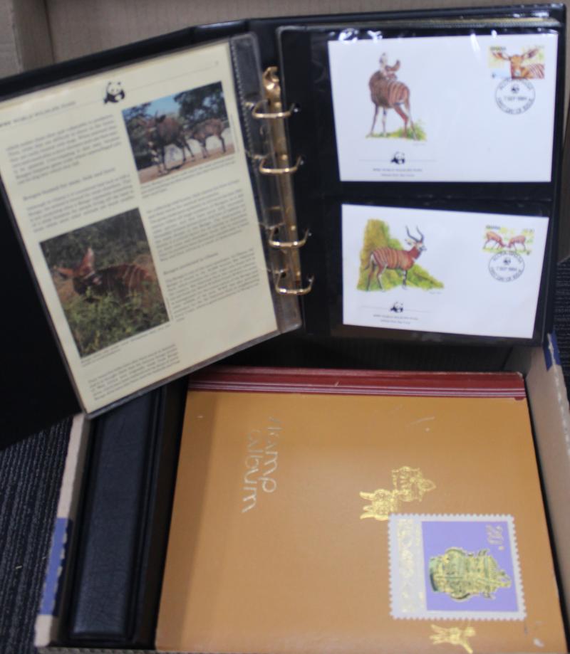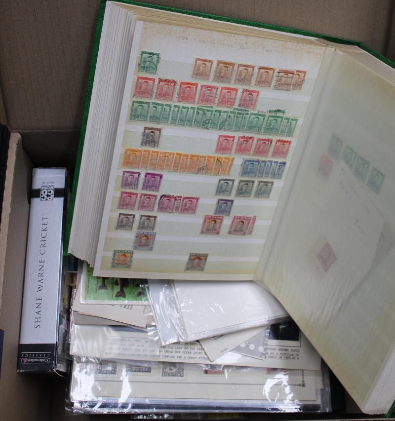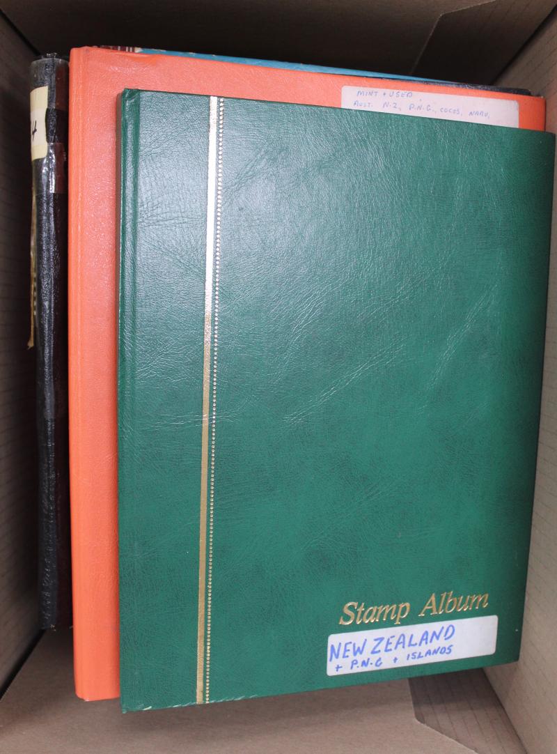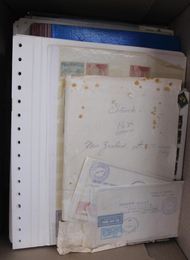 stockbooks with lots of toning; New Zealand FDCs, packs, some mint stamps including Niue & Tokelau and a batch of commercial covers; boxed World Wildlfe Fund in two volumes and 1983 'Commonwealth Collection'. Weighs 50kg+. Proceeds to Legacy.