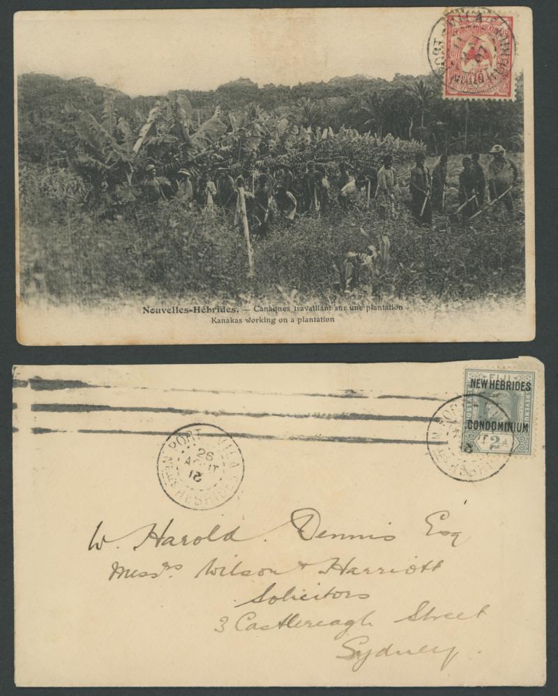SANDWICH' cds; 1907 social usage of local PPC (Kanakas) to New Zealand with New Caledonia 10c Kagu tied to the viewside by 'PORT-VILA...' cds, message states "...mail only goes from here about once a fortnight..."; 1907 cover-front to France with New