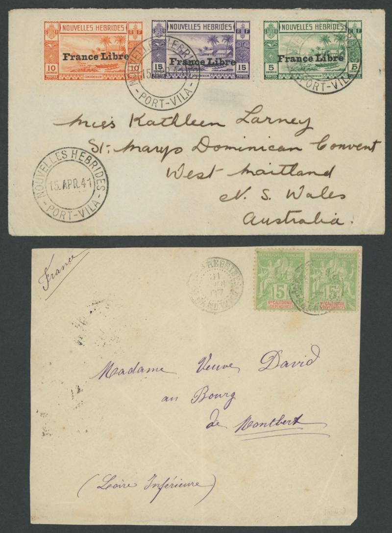 Caledonia 5c pair tied '.../PT SANDWICH' cds (month slug inverted); 1912 commercial cover to Sydney with 1910 Overprints on Fiji 2d grey SG 12 tied by the French 'PORT-VILA/...' cds (year slug inverted); and 1941 possibly social cover to a convent in