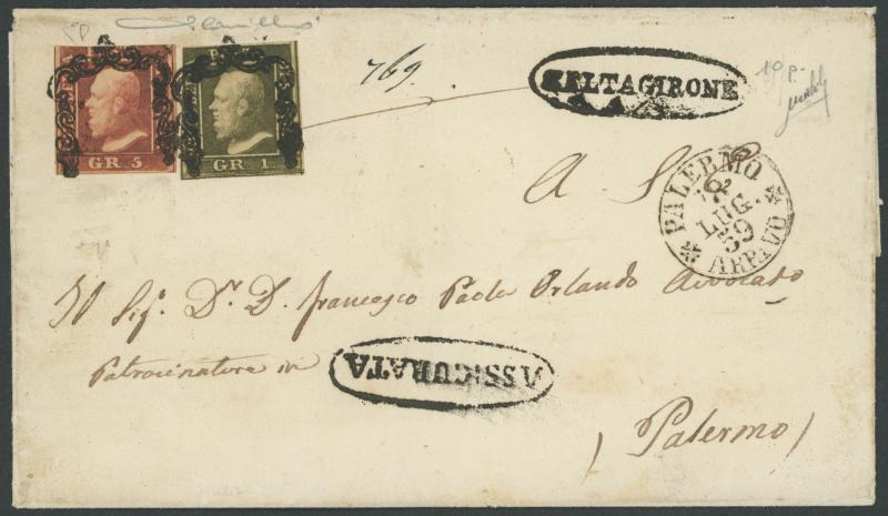 KINGDOM OF SICILY: 1859 outer with 1gr deep olive & 5gr deep rose-carmine Sassone Spec 5b & 9d both with almost full margins tied