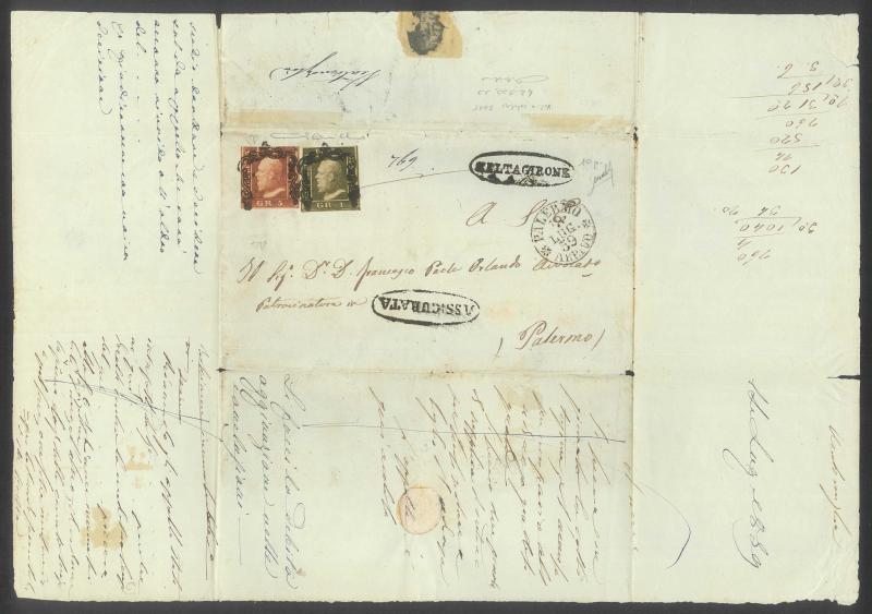 by very fine strikes of Sicily's famous & idiosyncratic "archway" cancels leaving the king's face untouched, 'CALTAGIRONE'-in-oval handstamp at upper-right & similar 'ASSICURATA' (= registered letter) handstamp below, very fine