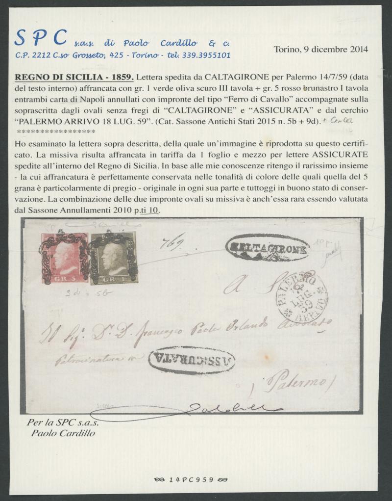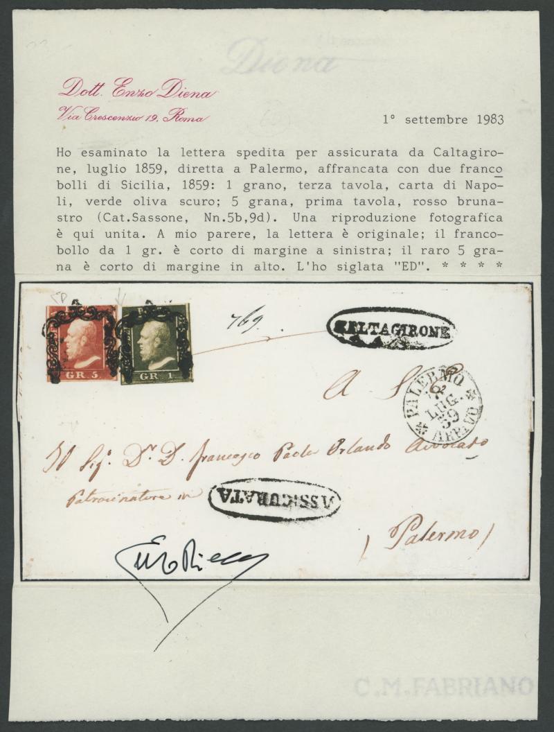 'PALERMO/18/LUG/59/ARRIVO' cds (Luglio = July) also on the face, extensive docketing on the flaps still a very fine classic cover. Enzo Diena (1983) and Paolo Cardillo/SPC (2014) Certificates. [Caltagirone is a central town on Sicily, some 140km SE