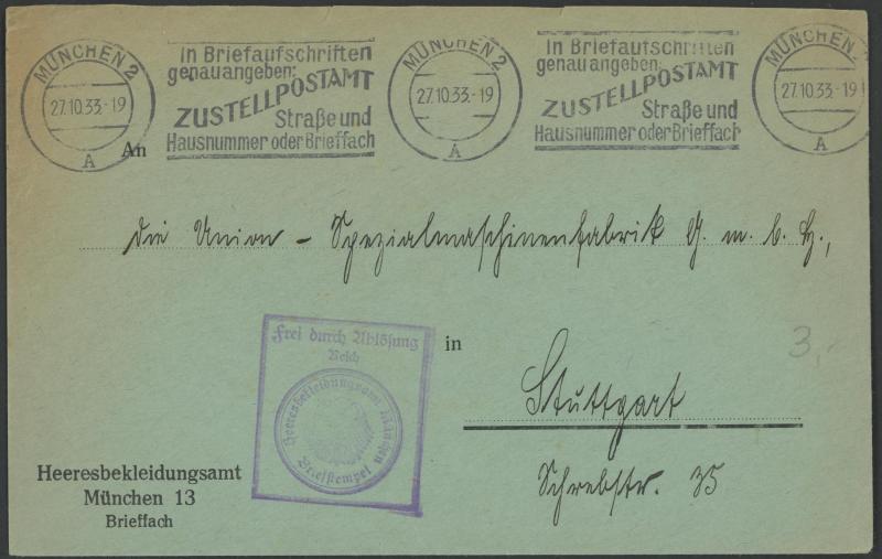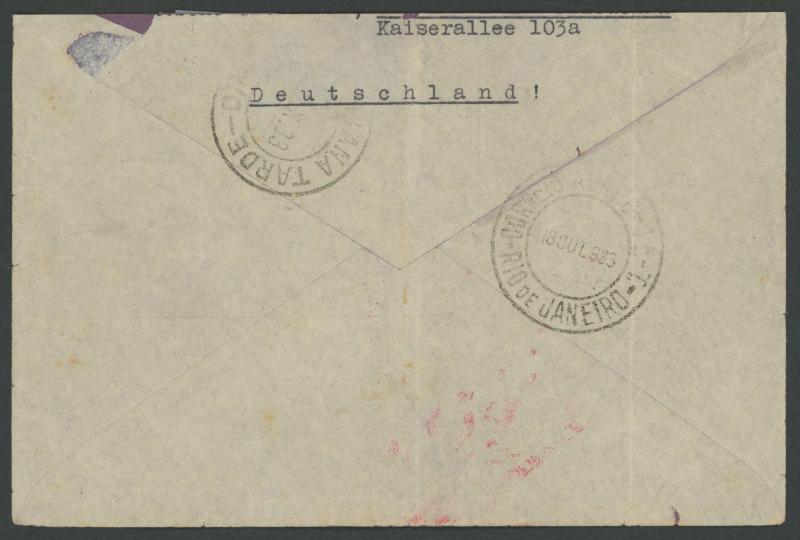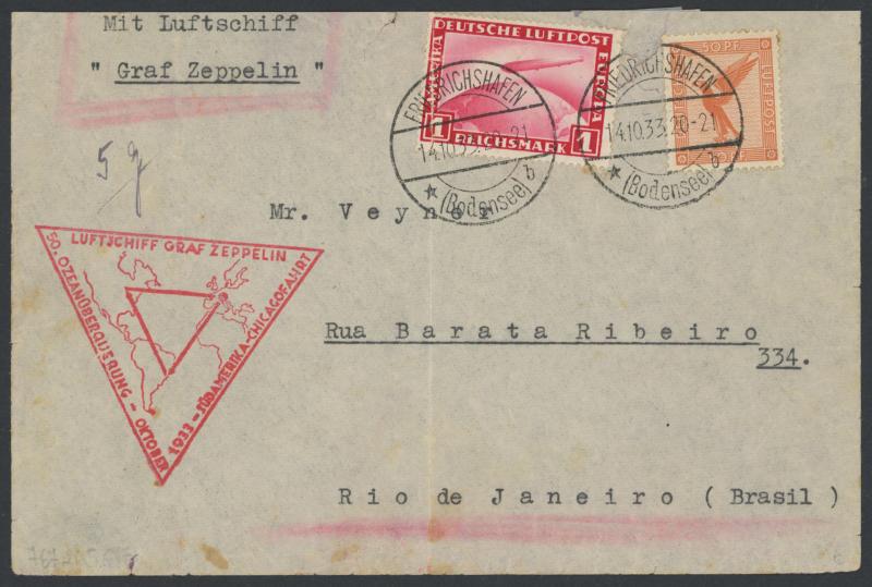 'FRIEDRICHSHAFEN/Bodensee/*LUFTPOST*' cds with flight cachet in blue & (translated) '...delayed due to cancellation of the first trip to America' cachet in red; 1933 (Oct 14) commercial cover endorsed 'Mit Luftschiff Graf Zeppelin' to Brazil with