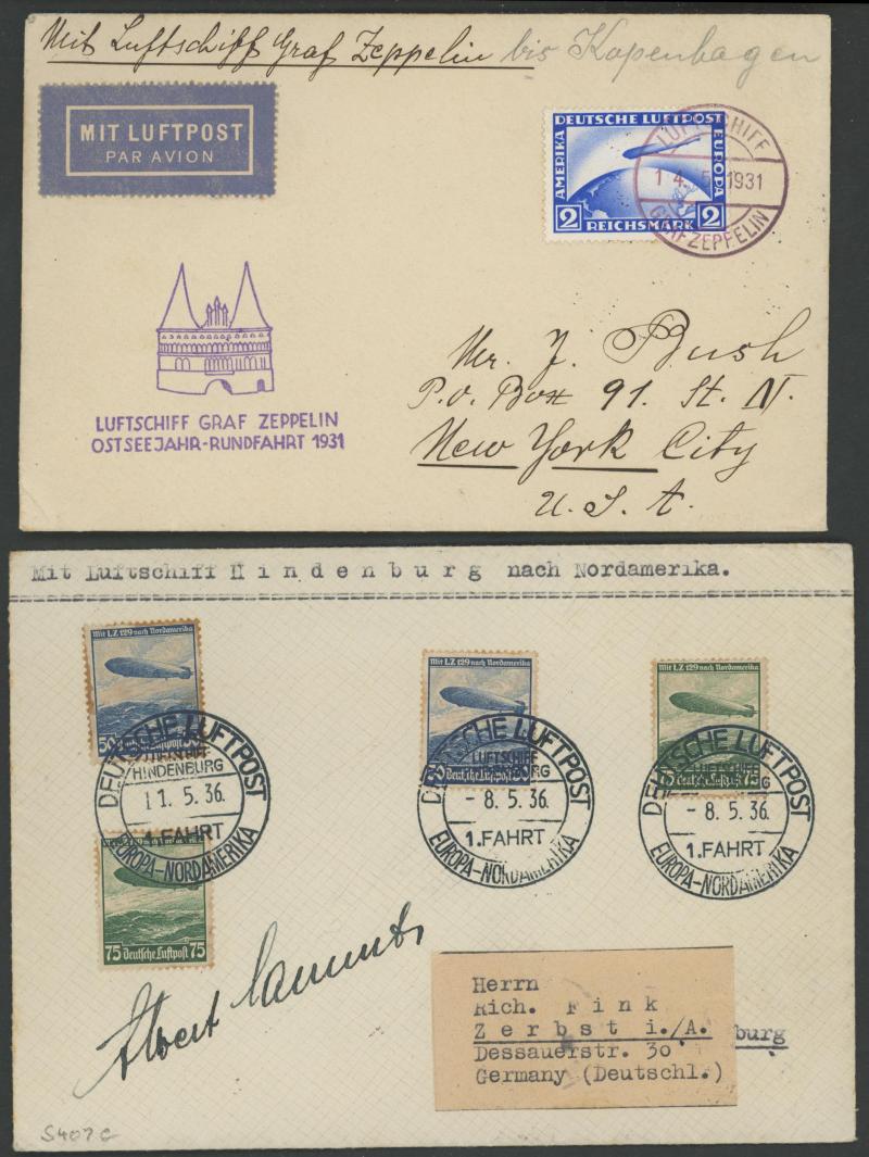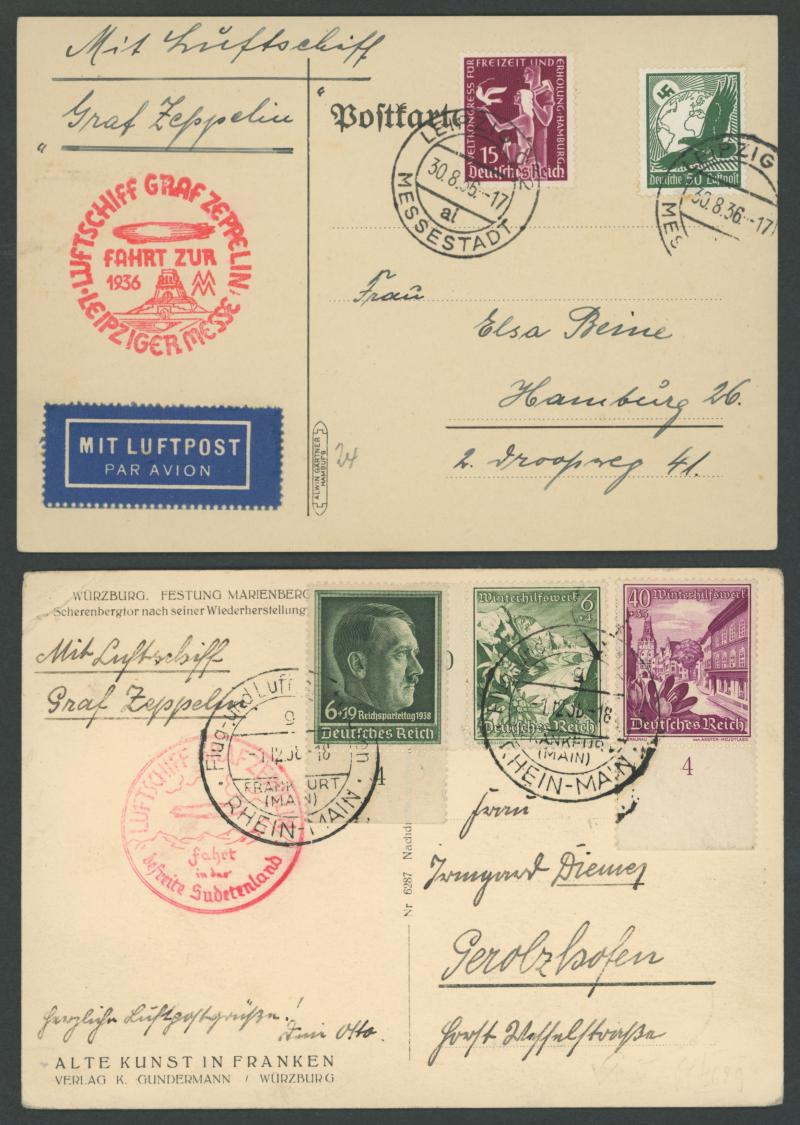 Hindenburg" with '.../4 FAHRT/EUROPA-NORDAMERIKA' cds; 1936 & 1938 postcards with superb 'LEIPZIGERMESSE' or '.../fahrt/in der/befreite Sudentenland' cachets in rosine.