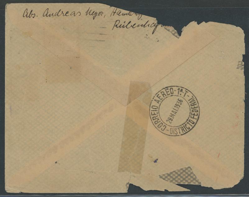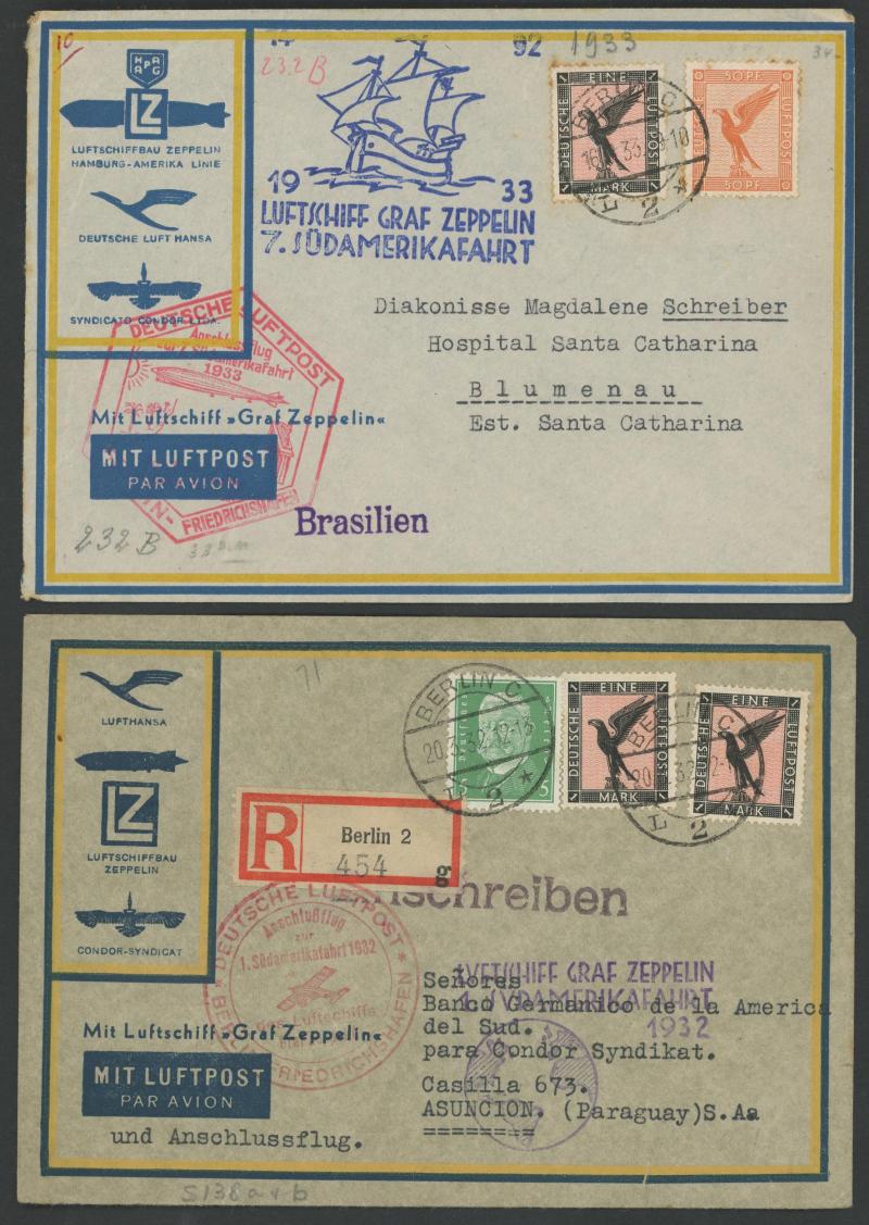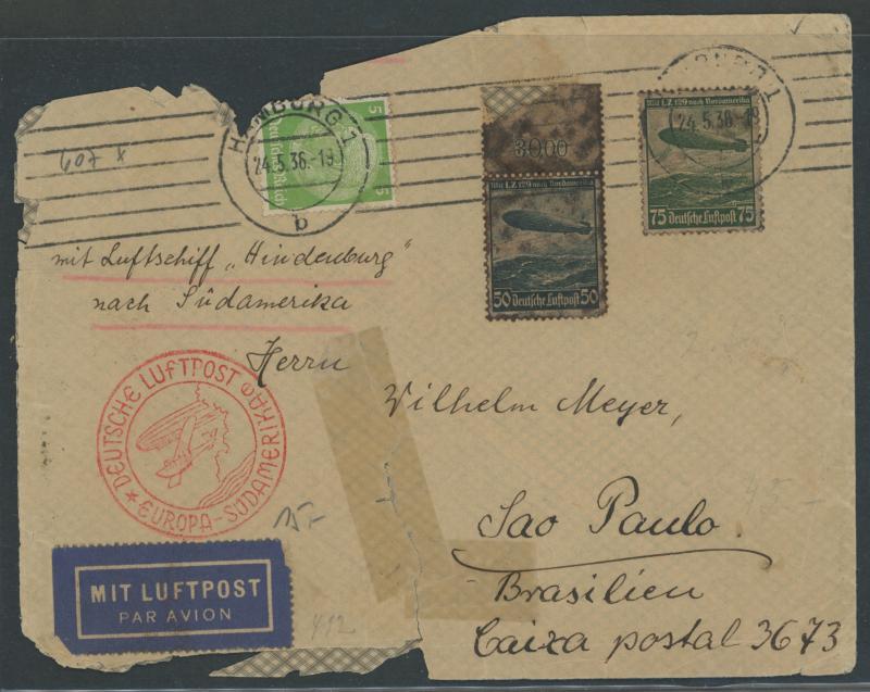 Airs 50pf plus 1mk Zeppelin and superb triangular flight cachet in rosine, vertical fold through the 1mk & minor peripheral tears; 1936 (July 4) badly defective commercial cover endorsed "Via Hindenburg nach Sudamerika" to Brazil; 1936 (July 4) "via