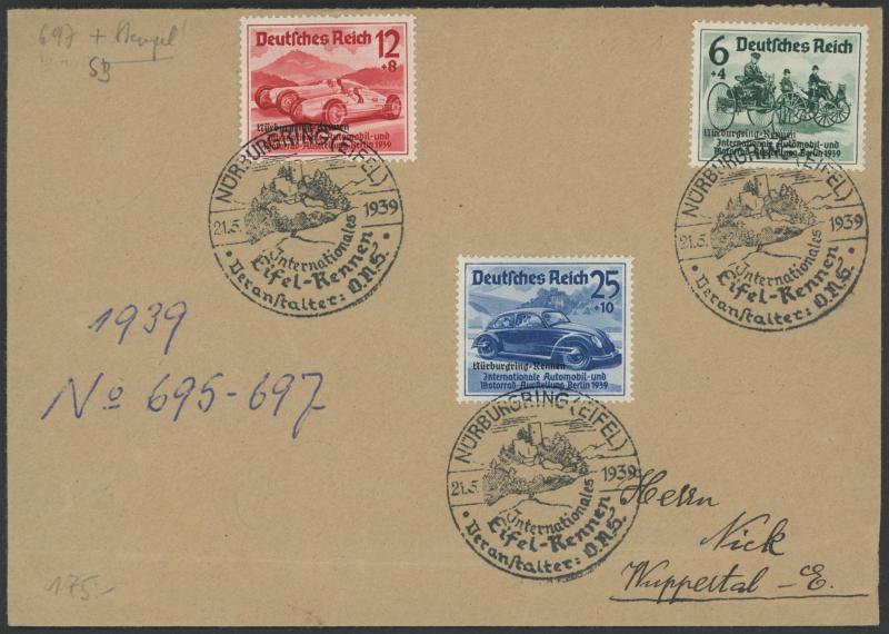 (faults), then mostly from Third Reich noted 1939 Nurburgring set on cover, Revenues for compulsory insurance schemes, postmark interest, etc, condition variable.