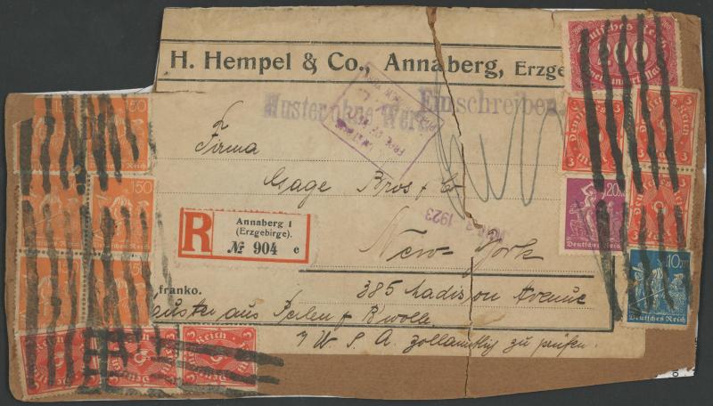 POSTAL HISTORY: Covers & Postal Cards including some hyperinflation frankings notably a 1923 registered parcel piece to New York