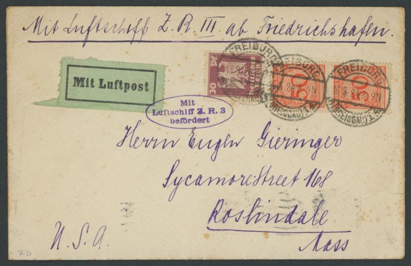 Luftpost' label tied by 'Mit/Luftschiff ZR3/befordert' cachet in violet, light spotting, with lengthy social letter that mentions Zeppelins; 1928 (Oct 7) card to New York with 2mk Zeppelin tied by 'FRIEDRICHSHAFEN/Bodensee/*LUFTPOST*' cds with flight