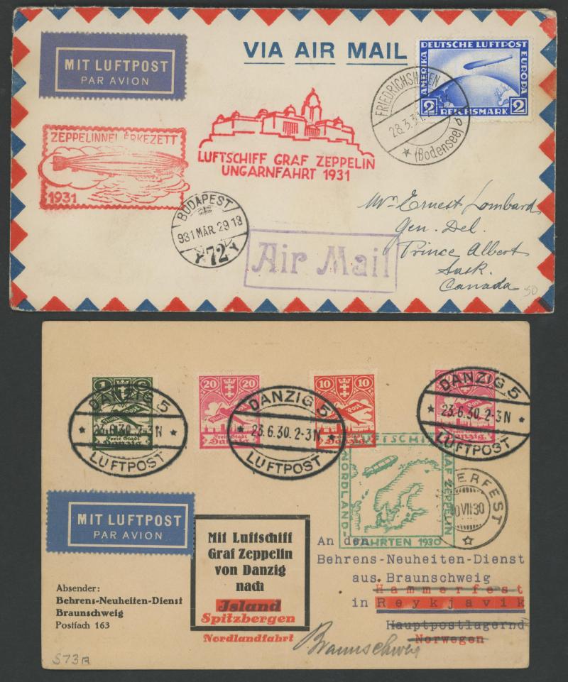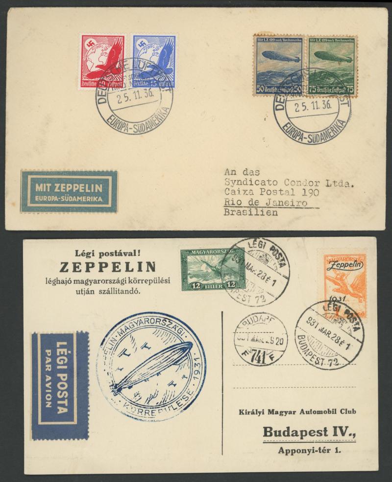 cachet in blue; 1930 Danzig Postal Card flown on Nordland Flight; 1932 & 1933 1st & 7th South American flights to Paraguay or Brazil both of which may be commercial; and a couple of others including with Zeppelin Overprints from Hungary & Brazil;