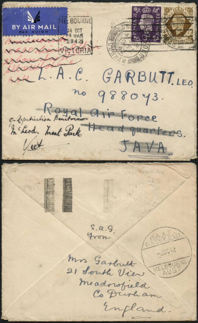 POSTAL HISTORY: 1942 (Feb 19) airmail cover from Durham, Great Britain to "Royal Air Force/Headquarters/JAVA" redirected (where?)