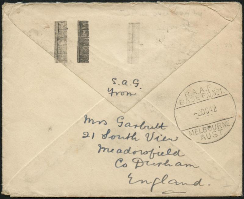 to the RAF Liaison Officer in Melbourne with very fine 'RAAF/BASE PO No1/8OC42/ MELBOURNE/AUST' arrival backstamp, forwarded again to "Repatriation Sanitorium/McLeod Mont Park" (a polite euphemism for the Mont Park mental asylum) with Melbourne