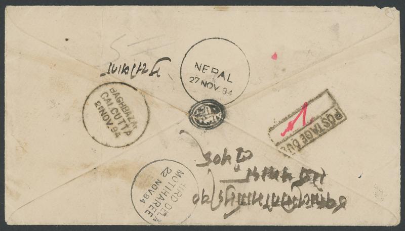 Sir Runoo/.../Primeminister..." with superb 24½mm 'NEPAL/ 27NOV84' arrival backstamp & boxed 'POSTAGE DUE/("2as")' handstamp; 1891 usage of stampless 'On Postal Service/EAST INDIA POST CARD' in pale green/white to 'The Commanding Officer/9th B.I."