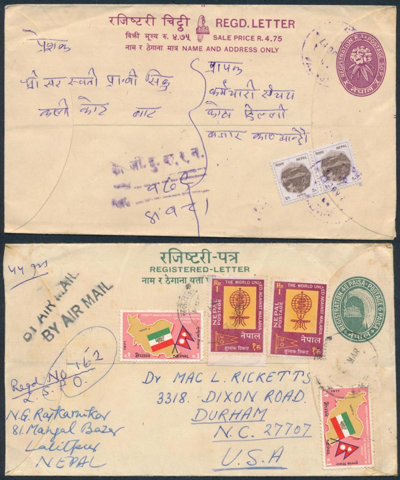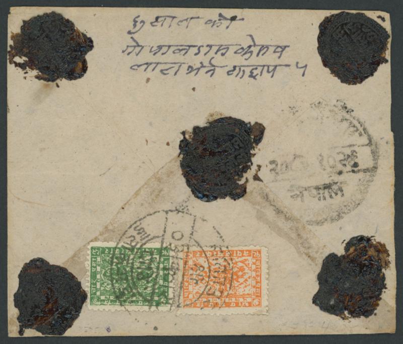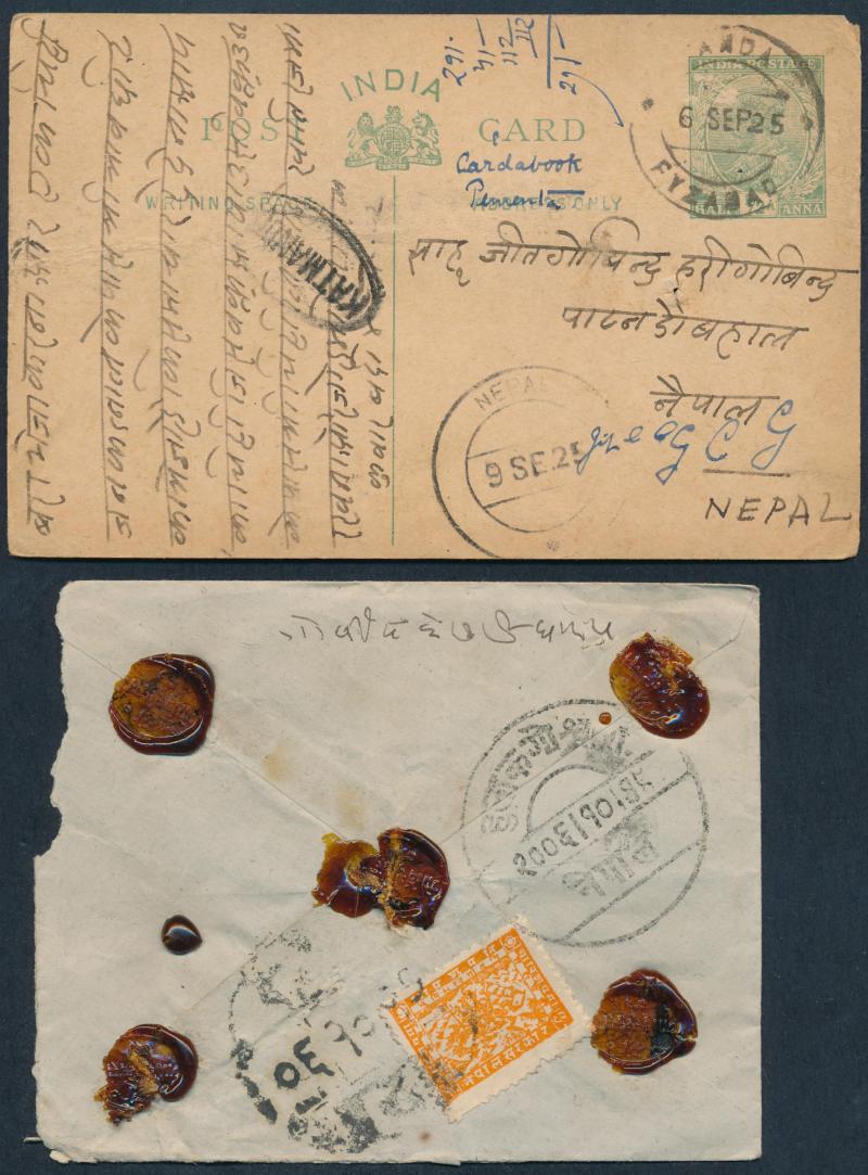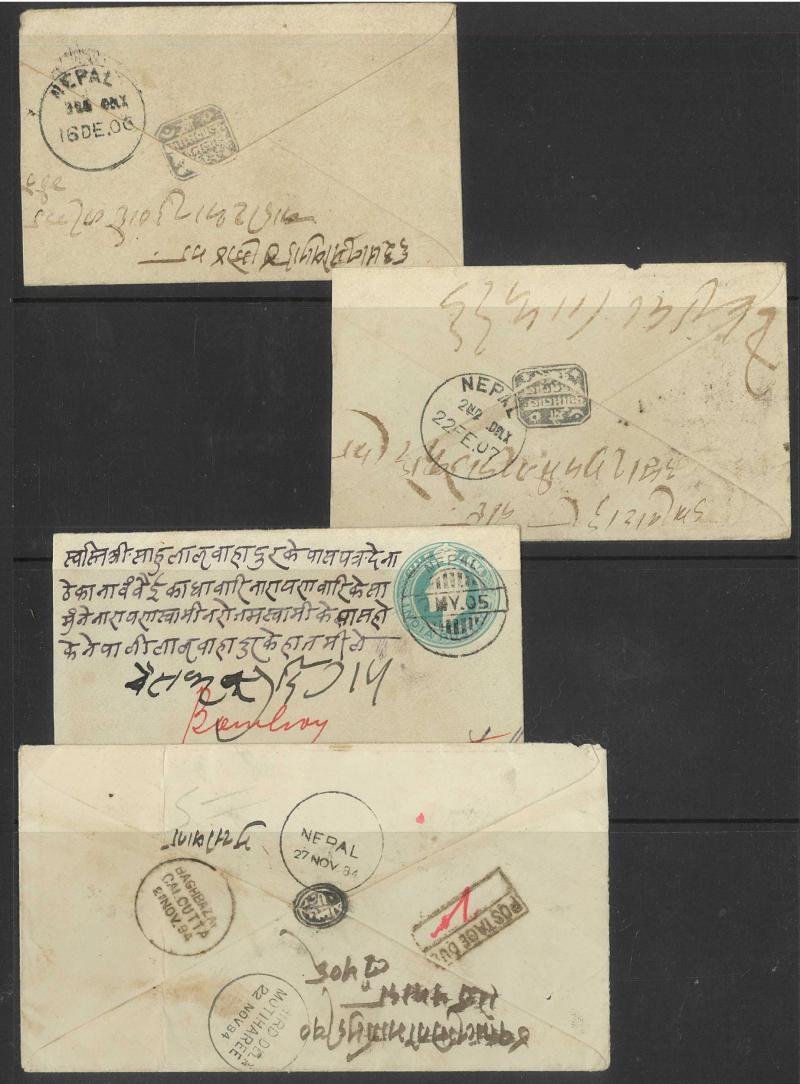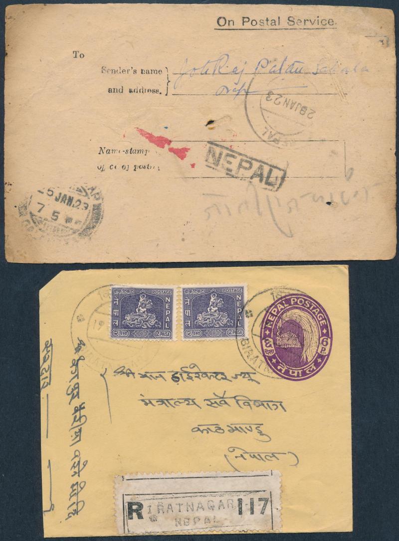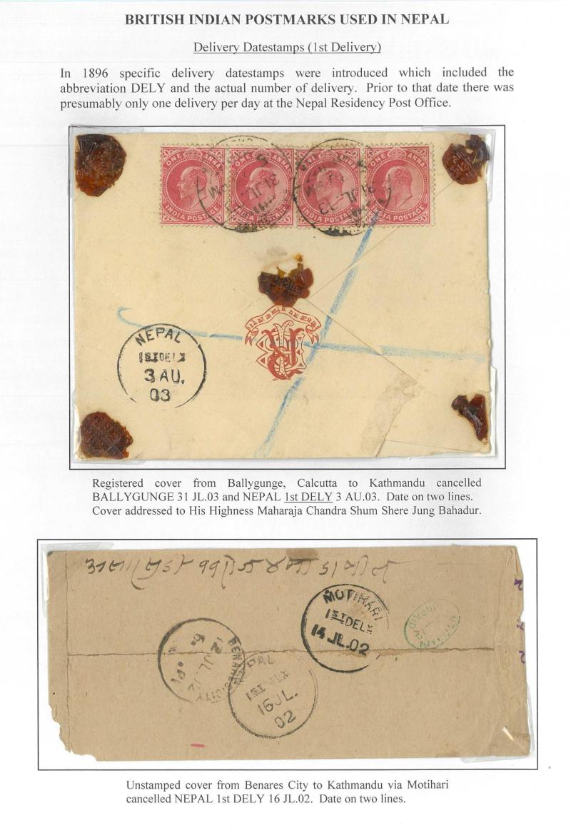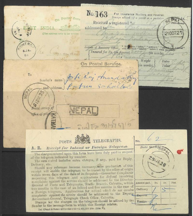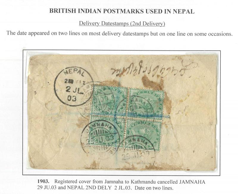 24½mm (registered), 'NEPAL/2ND DELY' with 2-line date or 1-line date, & 'NEPAL/3RD DELY' with 1-line date (rare); and 1925-28 usages of 31½mm cds on 'On Postal Service' pre-UPU 'Acknowledgment' of receipt of registered letter also with 'NEPAL'-in-Box