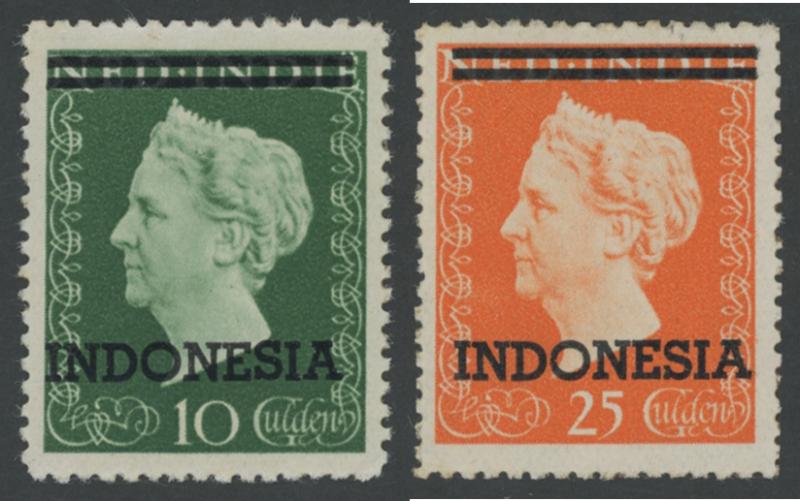 1948-49 'INDONESIA' Overprints on Wilhelmina 10g green & 25g orange SG NI539 & 540, clean-cut perfs, unmounted, Cat £400 (2017).