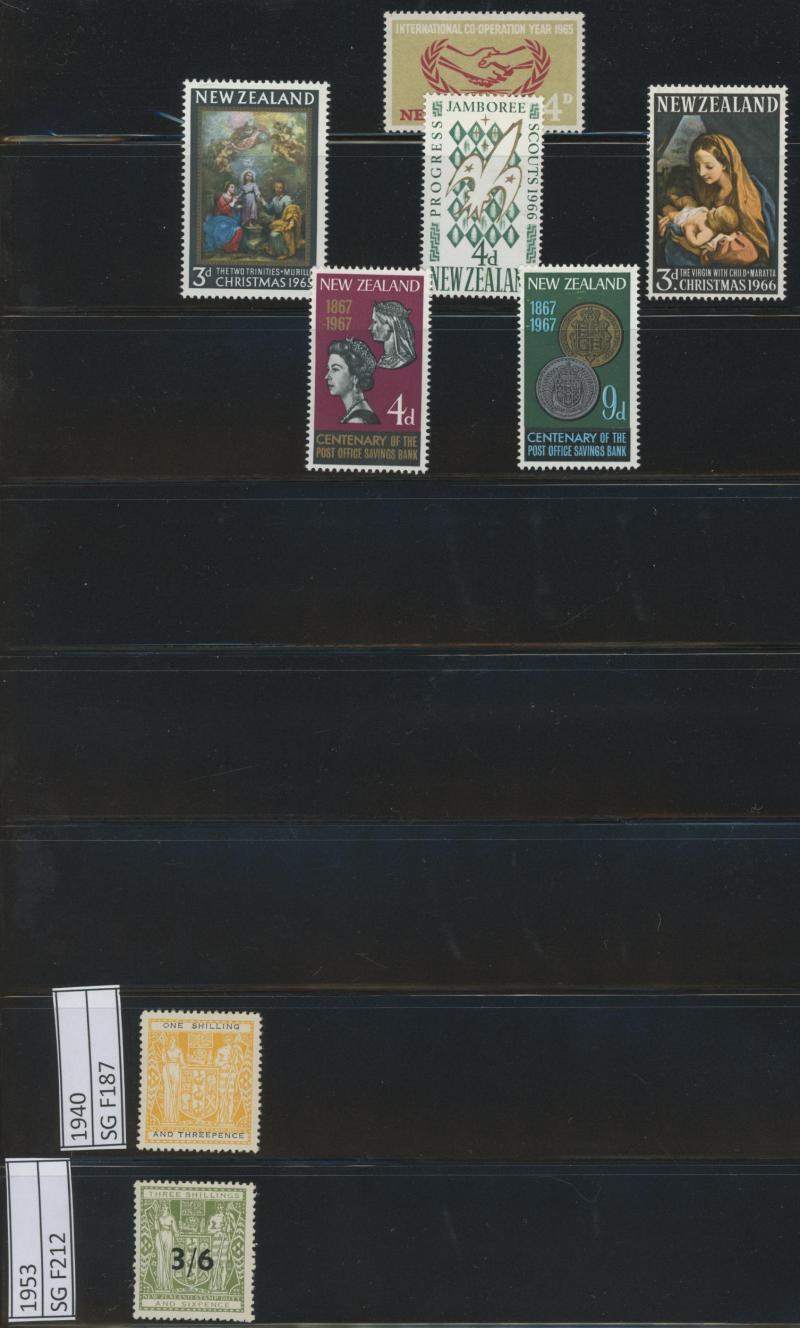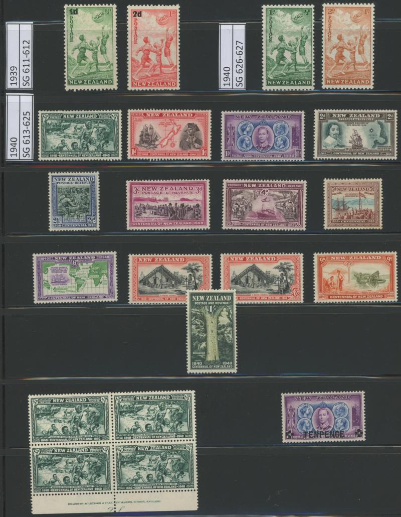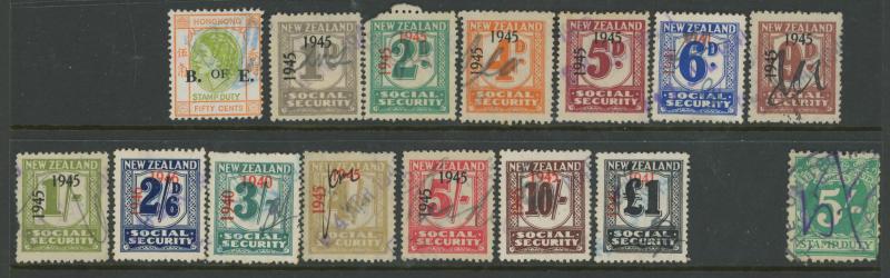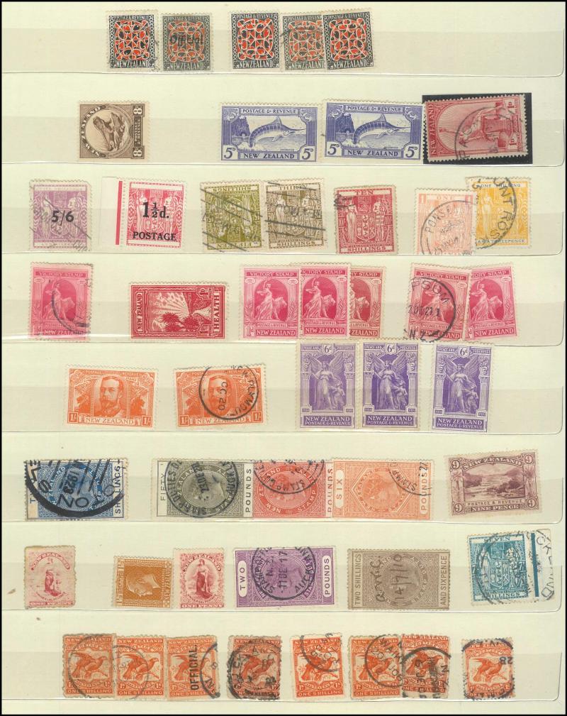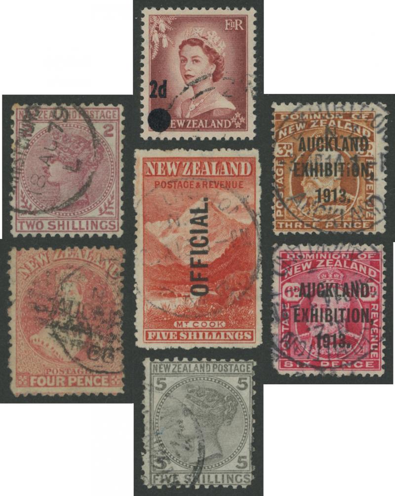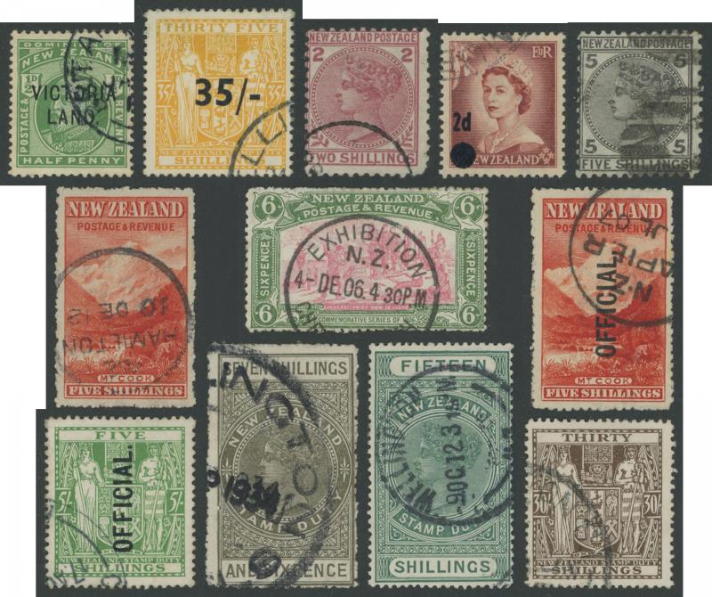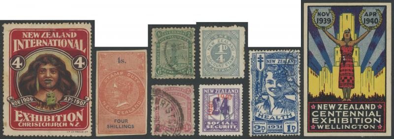 x40+ mostly with machine cancels (Cat £8000+), QV Revenues selection to £50 including Imperf 4/- mint, Social Security x15 to £4, Christchurch Exhibition labels #2 to 7 (no #6), etc, also 1936 commercial express cover and Ross Dependency 1972