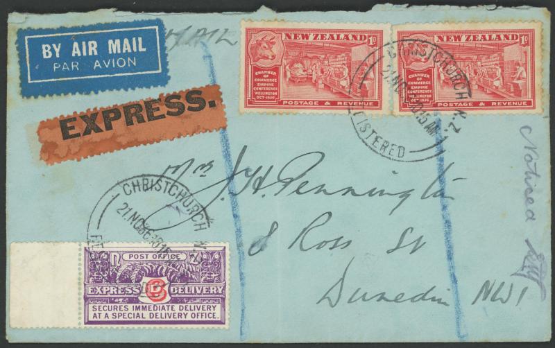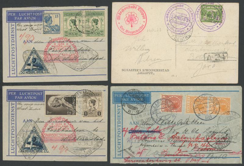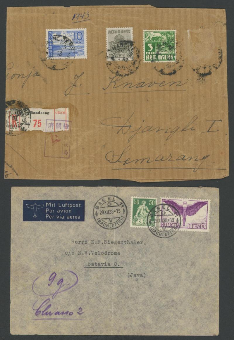 handstamp in blue, 1931 inwards airmails from the Netherlands at 36c rate x2 one re-directed with 'BUITENZORG/SEINT VIA RADIO' diamond backstamp, 1938 inwards airmail from Switzerland with Helvetia 50c & Hermes 1f rated "9g" weight, 1941 inwards