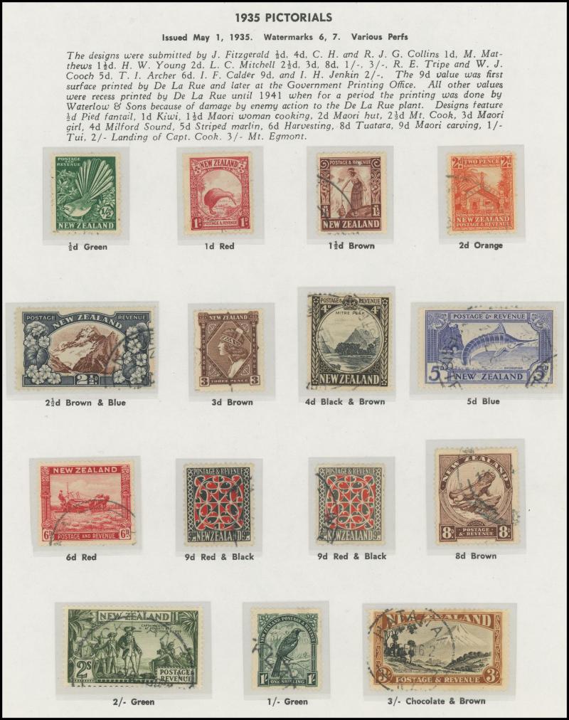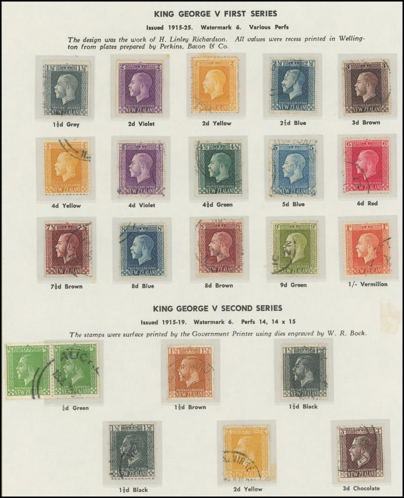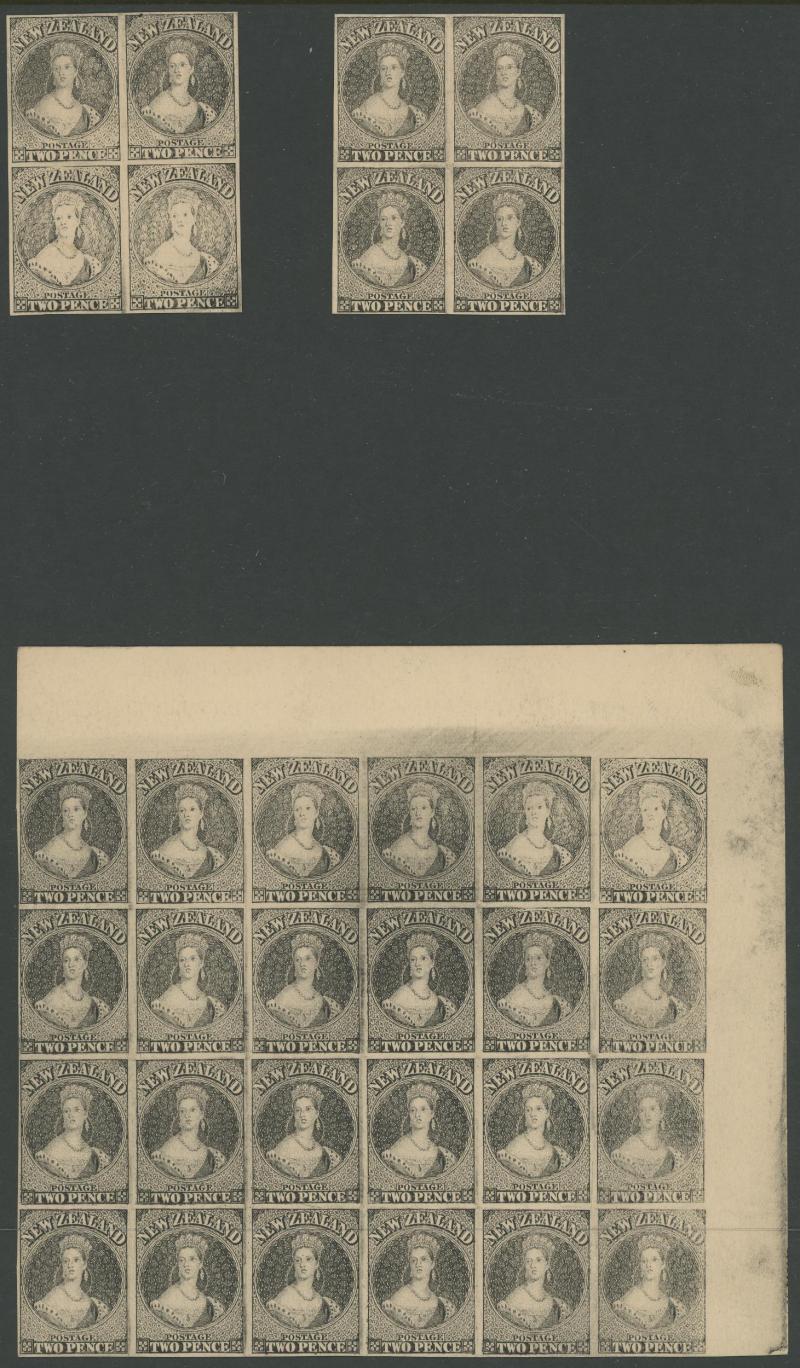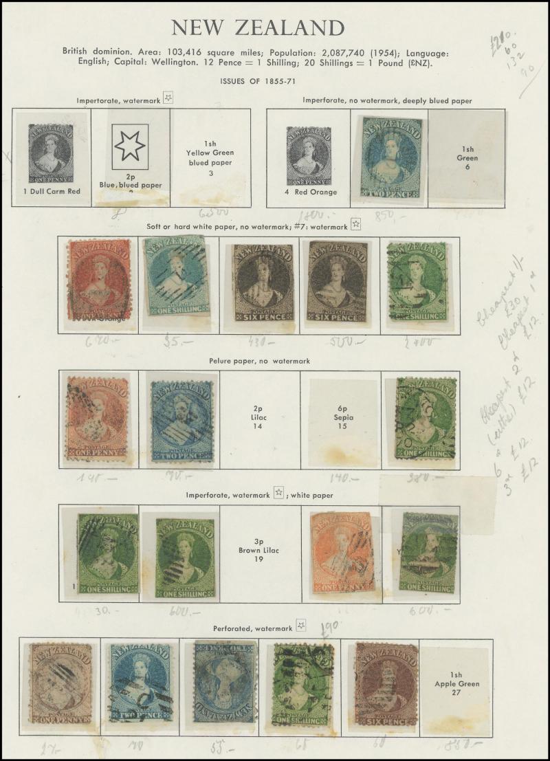 brown (tiny thin) & 1/- blue-green, Large Star Wmk 1d vermilion (small thin) & 3d lilac, and NZ Wmk 1d vermilion all used with full margins, also Hausberg reprinted imperforate plate proofs 2d black on thick card blocks of 4 x2 and marginal block of