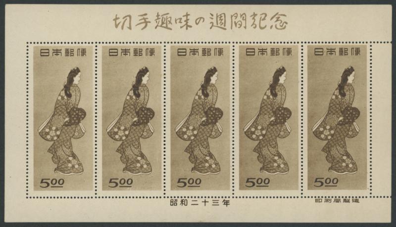 1948 Philatelic Week 5y 'Beauty Looking Back' SG 514 complete sheetlet of 5 with inscription at top & imprint at base, lightly