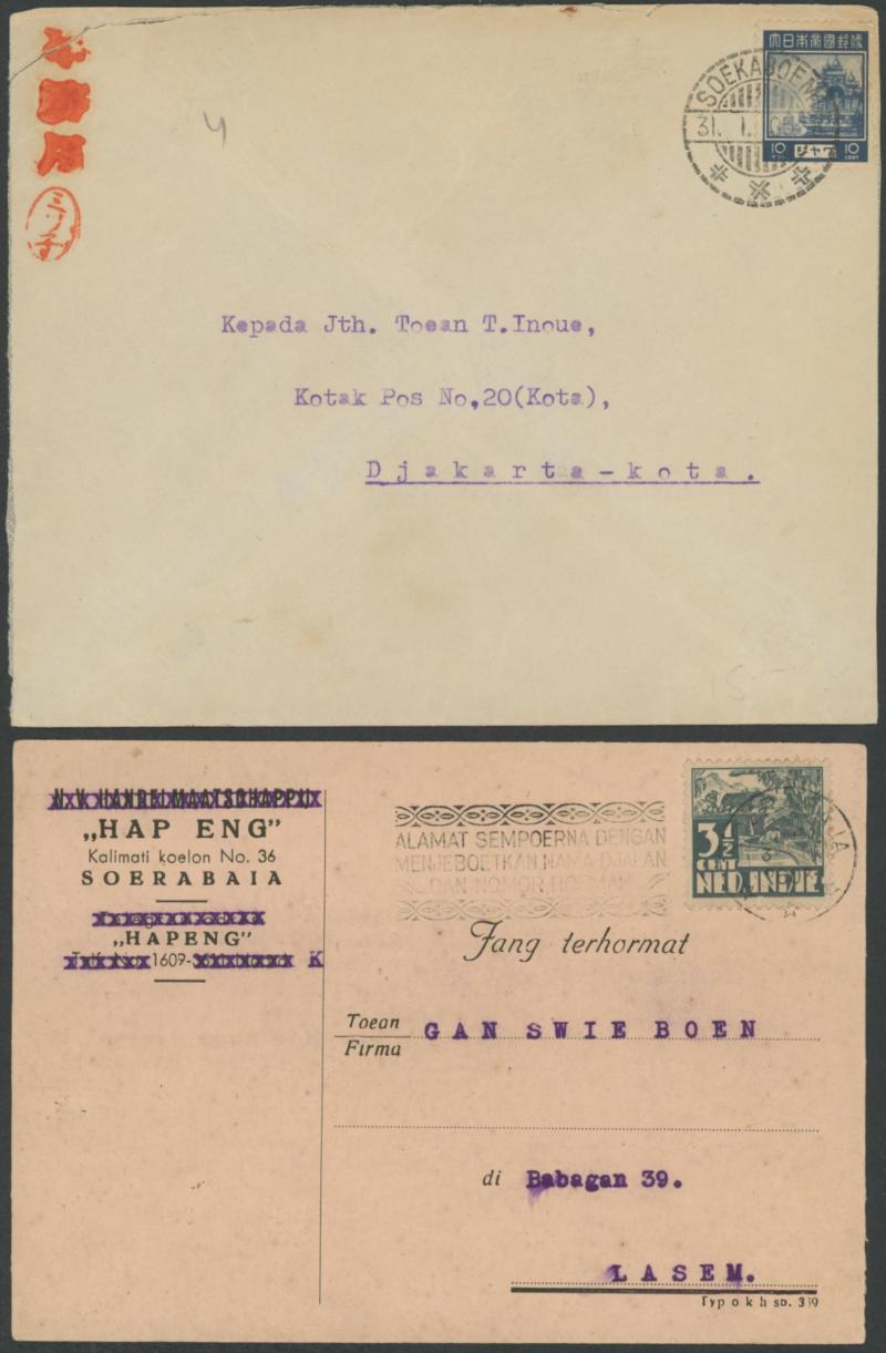 POSTAL HISTORY: 1942-45 Japanese Occupation two covers one 1943 official unfranked from Jakarta, the other 1945 with Pictorial 10c