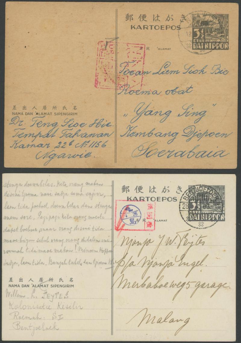 3½s grey x7 one with printed advertising for handicrafts & jewellery, and one Pictorials Village Scene 3½c orange-red, good range of censor markings and despatch postmarks including Bentjoeloek, Bondowoso, Kediri, Lawang, Pradjekan, Toeban, etc, a