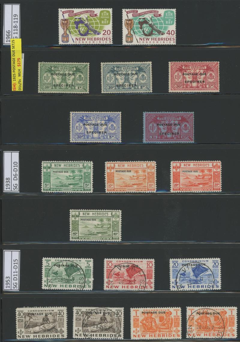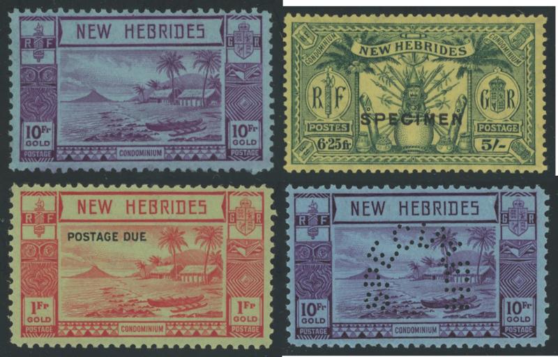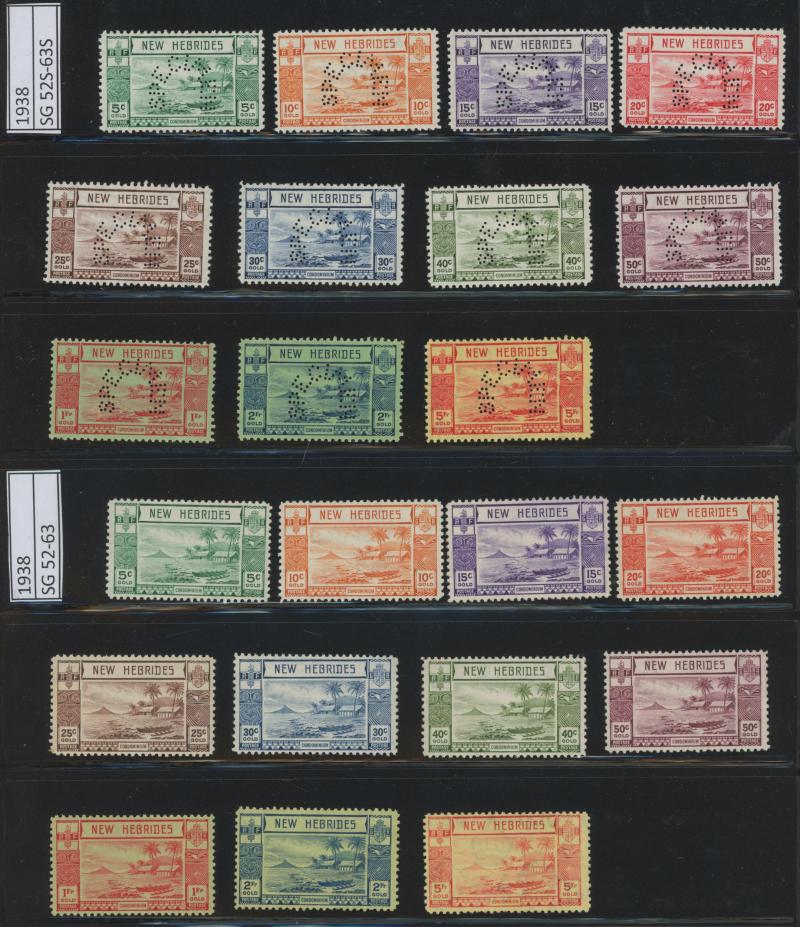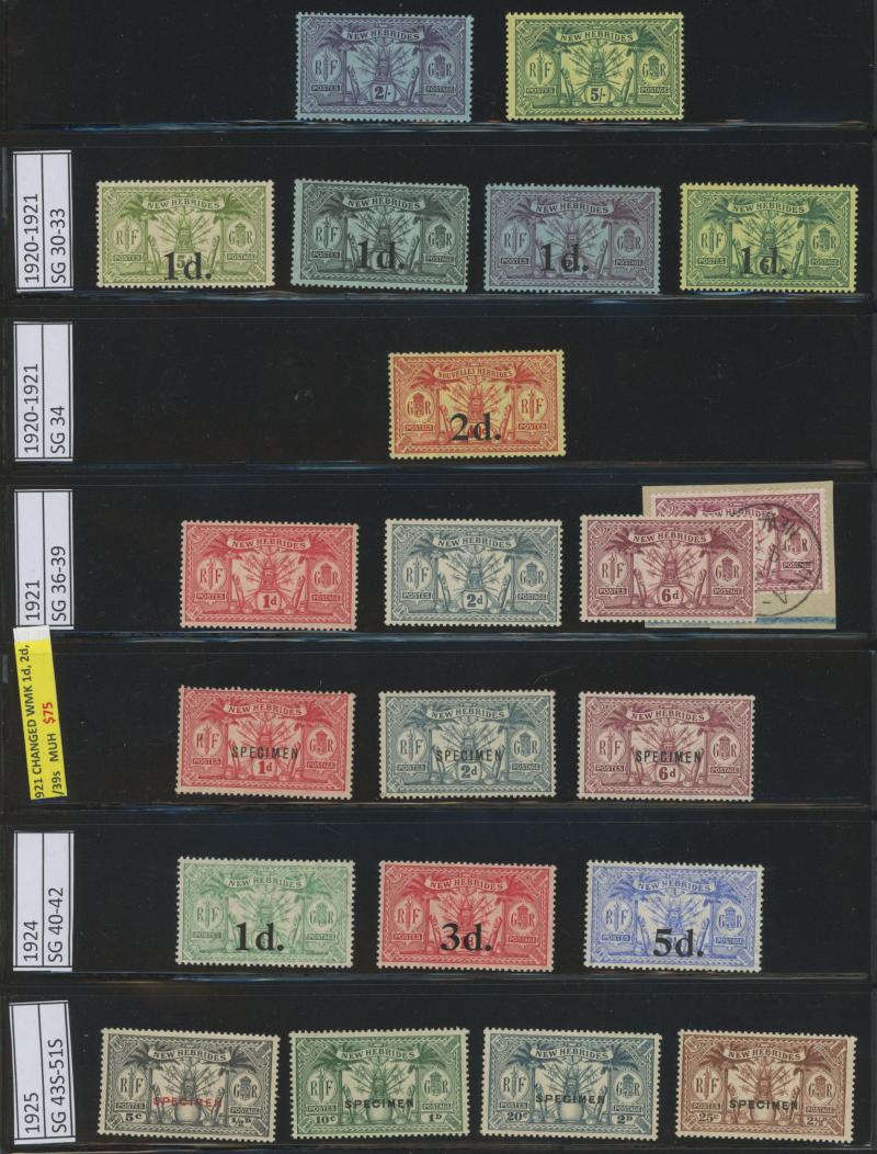 KGV 1921 Weapons and Idols set plus overprinted 'SPECIMEN' set and 6d purple used, 1925 Weapons and Idols set with French and British currency plus overprinted 'SPECIMEN' set, French issues 1925 Weapons and Idols set used, KGVI 1938 Lopevi Island and