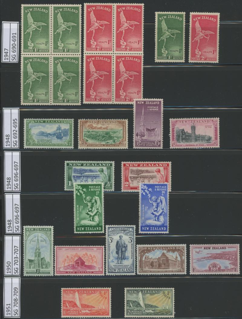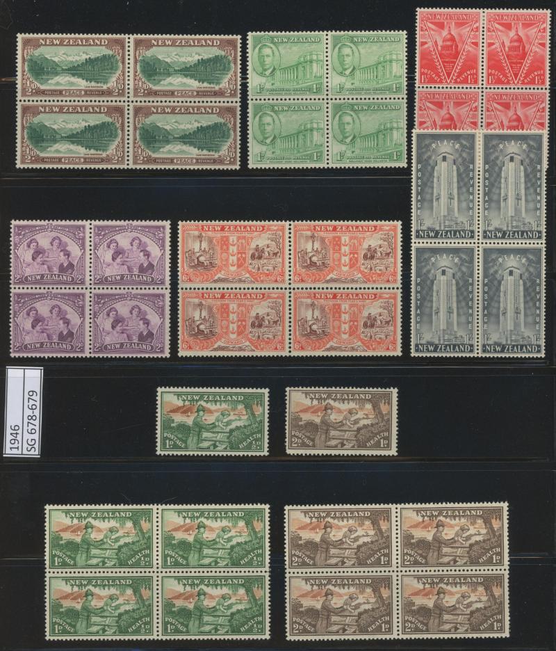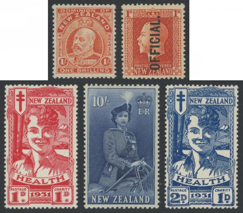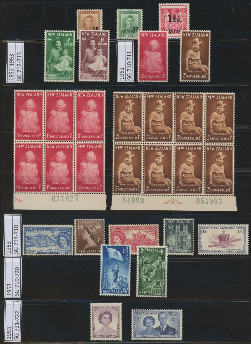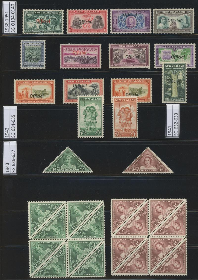sets, Christchurch Auckland (6d rounded corner) & Dunedin Exhibition sets all with Exhibition cds, Healths complete plus unmounted M/Ss, etc, QEII '2d' on Stars 1½d, Postal Fiscals 7/6d & 12/6d and fiscally used £3/10/-, Officials including