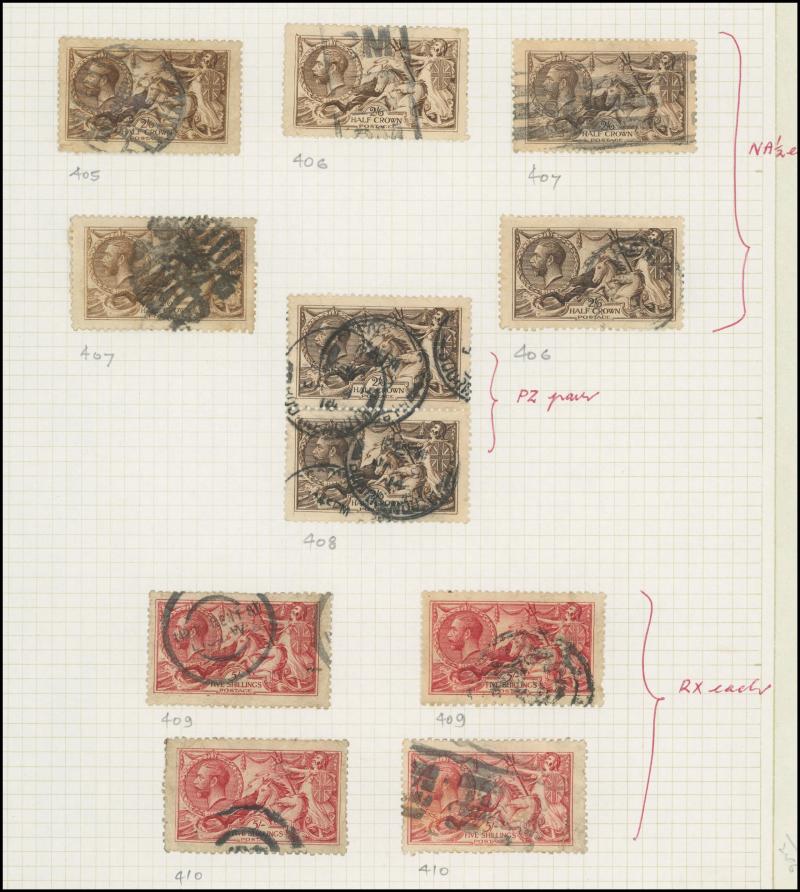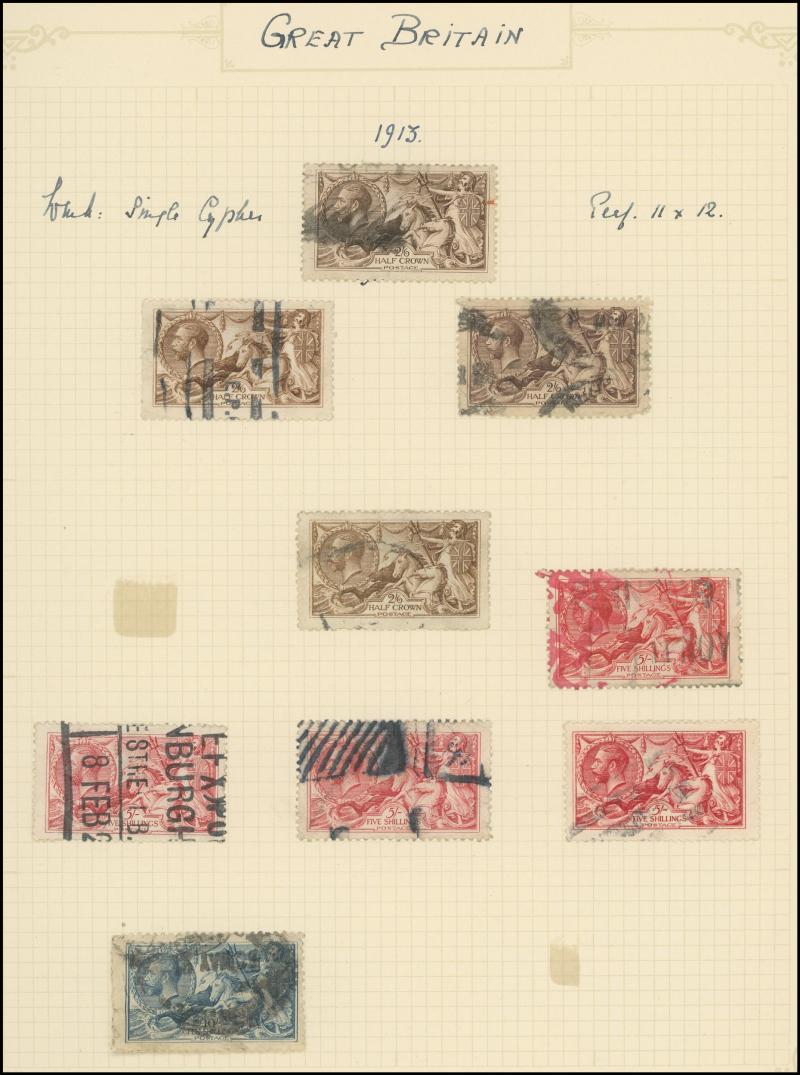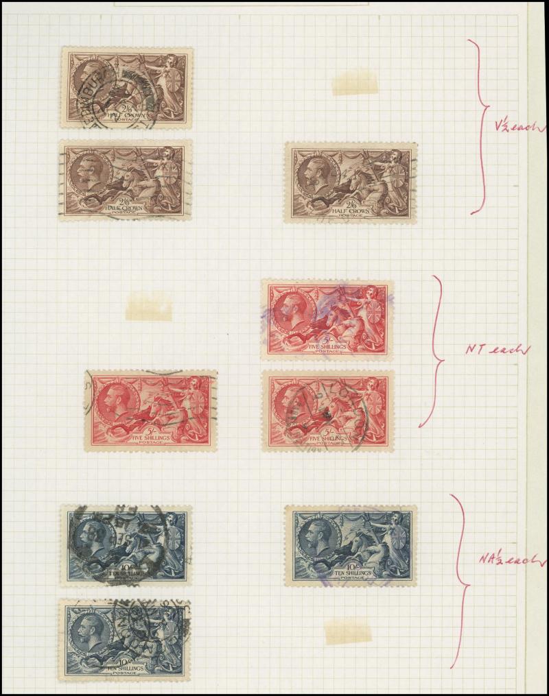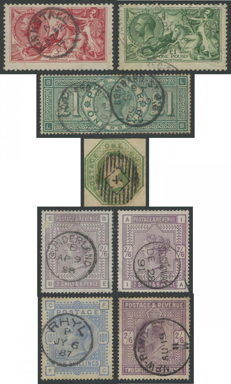 brown, 2/- brown (wing-margin removed), 2/- blue, Lilacs & Greens 9d & 1/-, 2/6d x2, 10/- and £1 green; KEVII 2/6d and Somerset House 9d x2; KGV Seahorses Waterlow 5/- & £1; etc, various numerals cancels and steel datestamps, Cat £9000+. A splendid