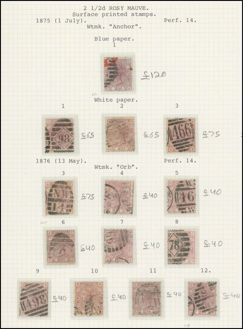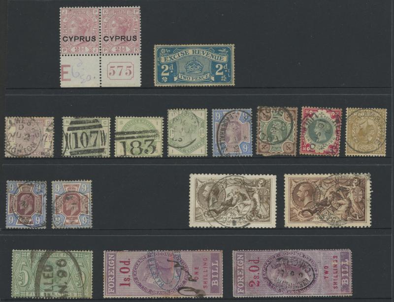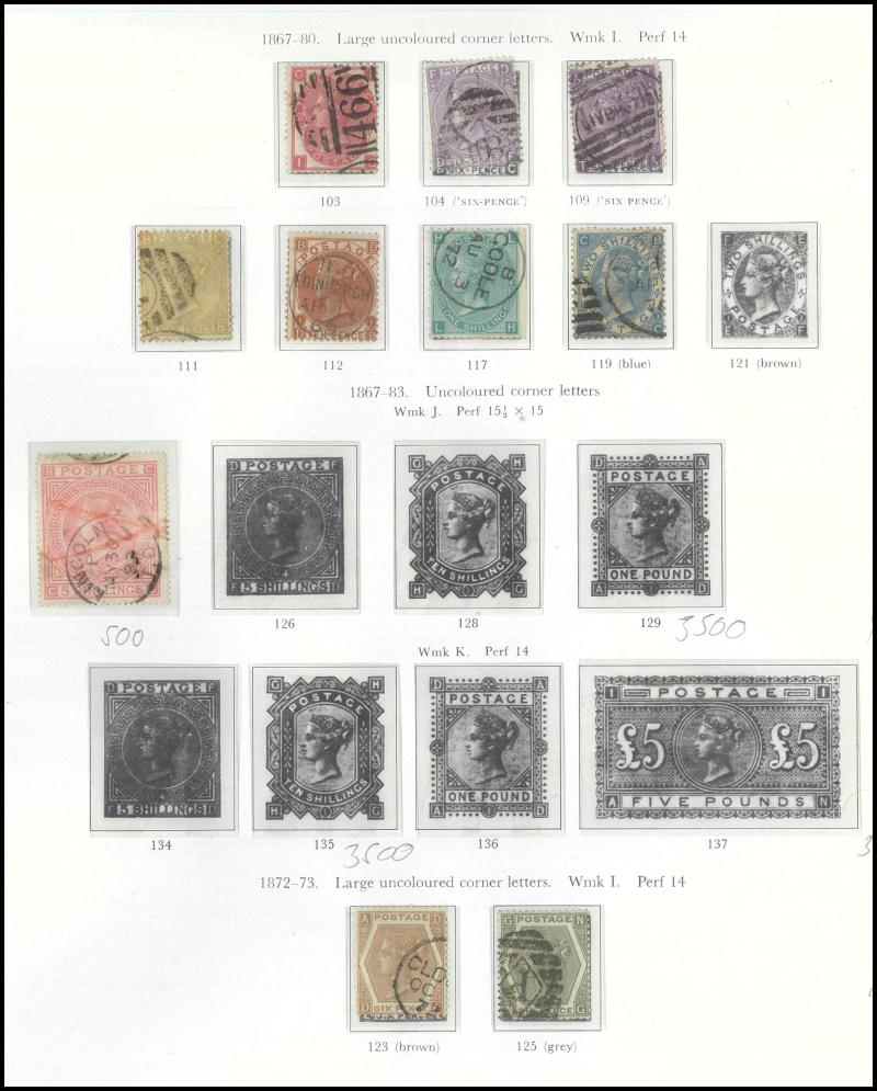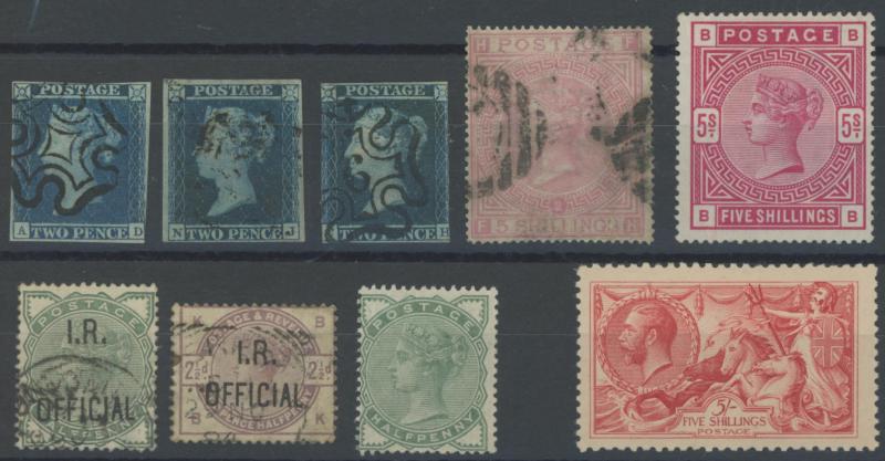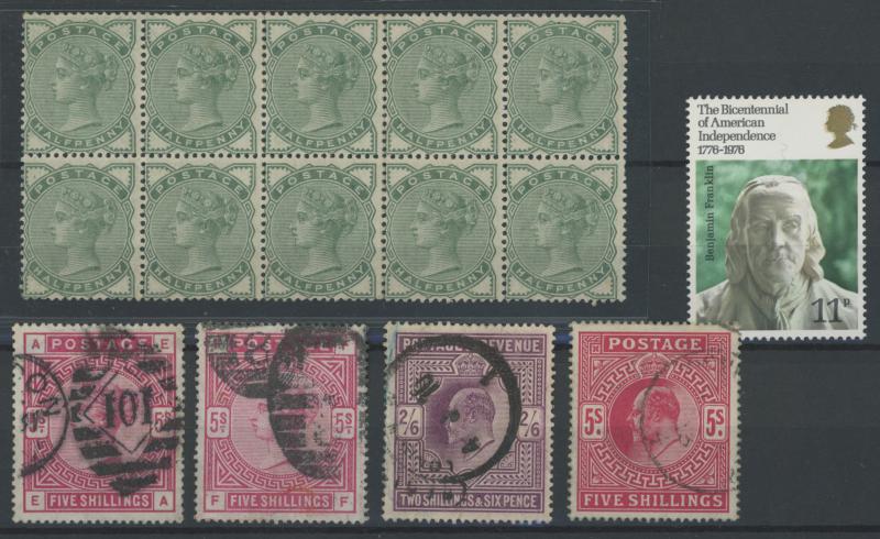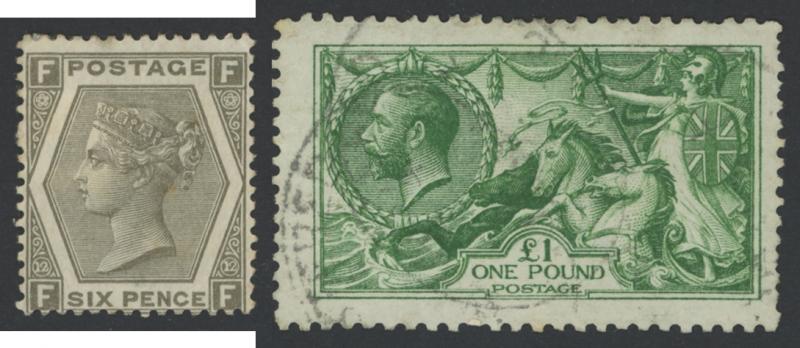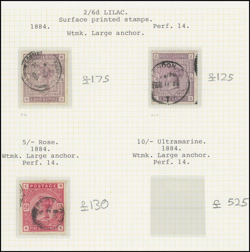 sound but aged and Anchor Wmk 5/- SG 134 well-centred & fine (Cat £2000), 1873-80 Wmk Orb 2½d rosy mauve Plate 17 with part-gum (Cat £1250), 1883-84 5/- mint but creased, KEVII 5/- very fine used with steel cds, 1915-19 Seahorses including De La Rue
