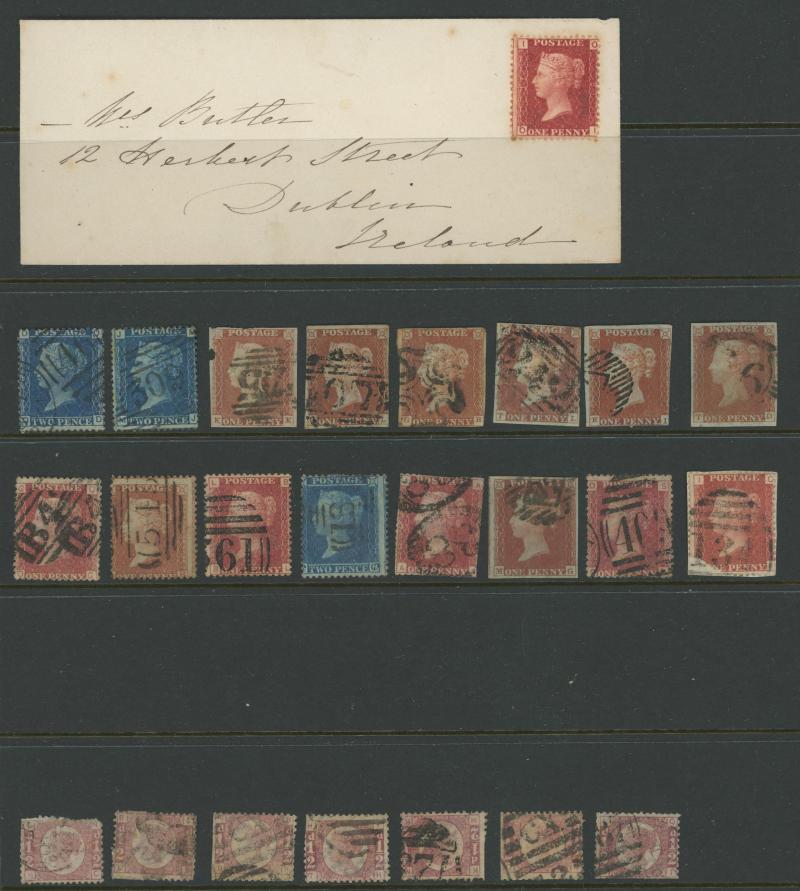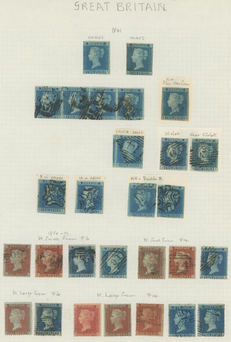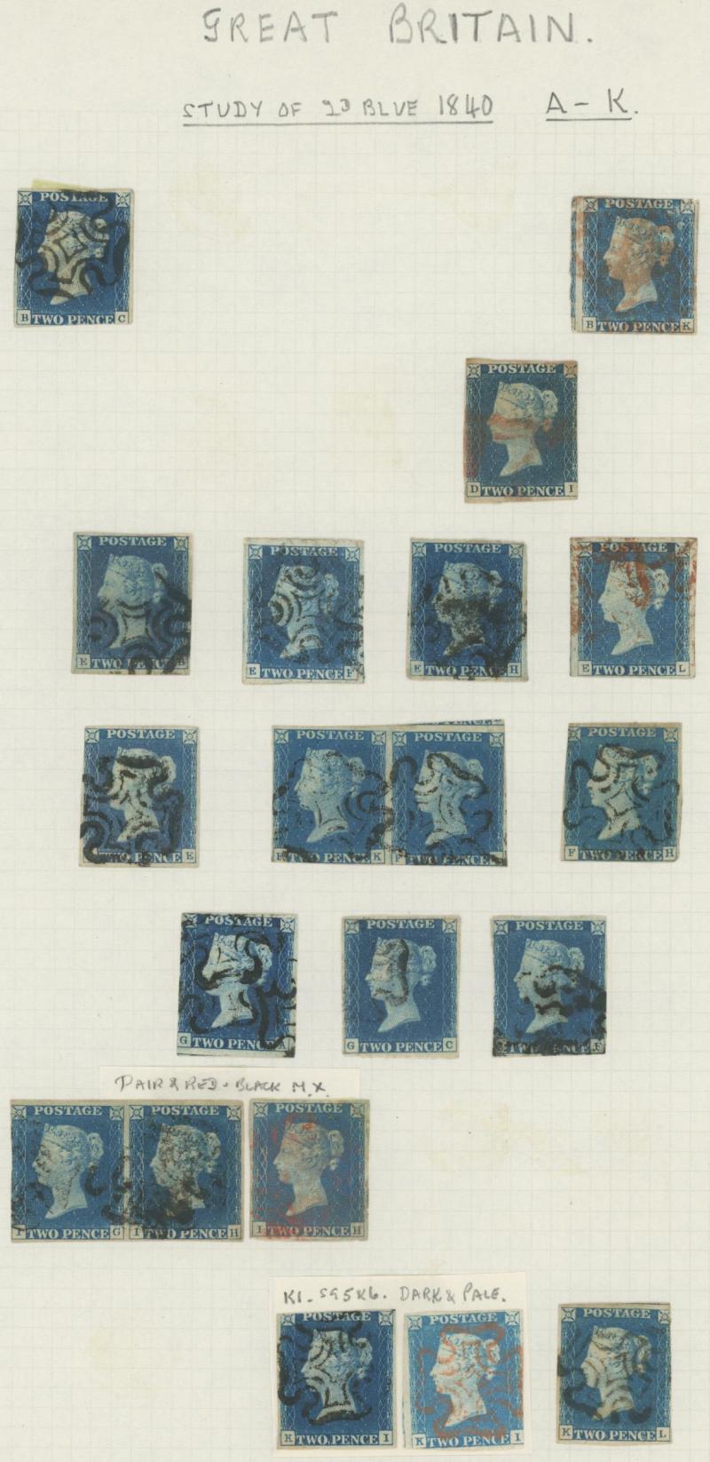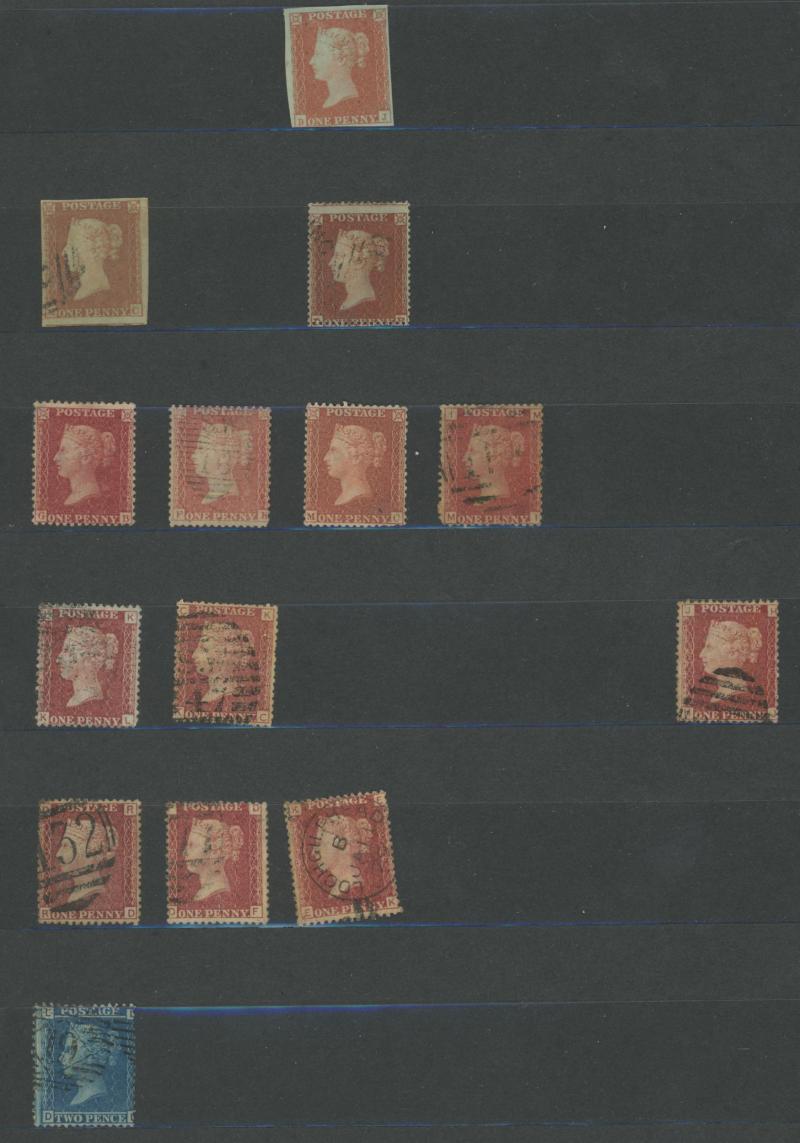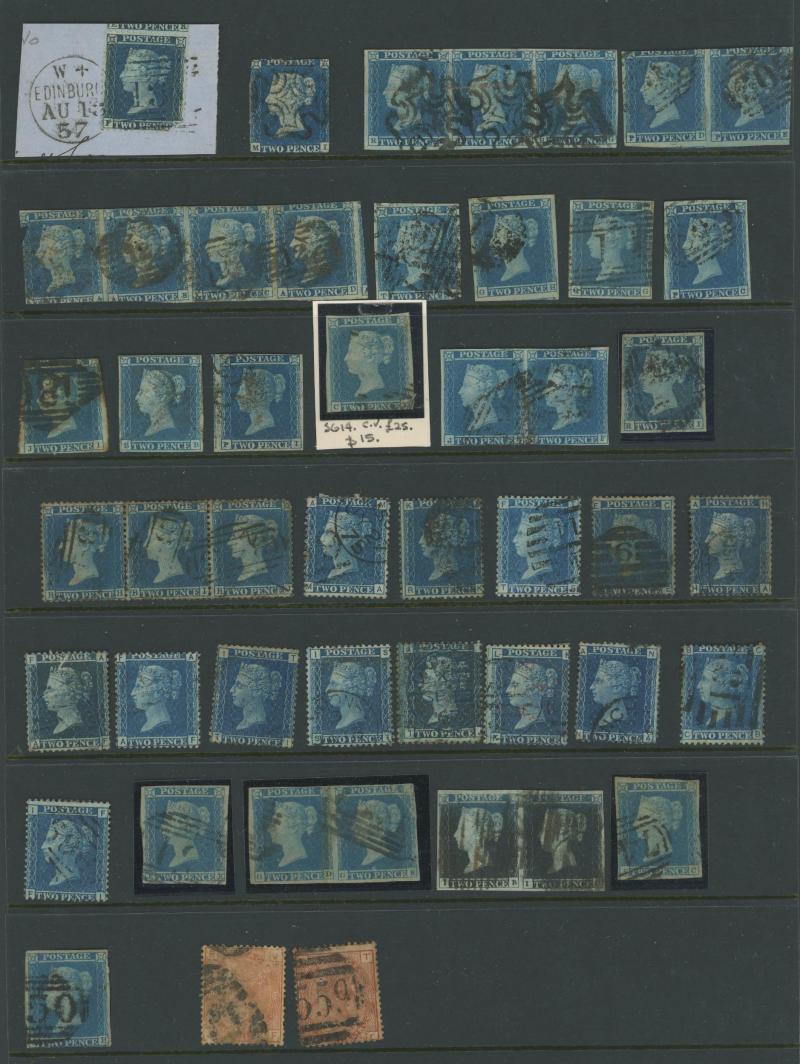 Tuppence Blues (no white lines) used x50 including four pairs, 1841 Penny Reds from Black Plates x15 (Plate 1 x2 & Plate 2 x6) with a few matching letter Black & Red duos and Tuppence Blues (White Lines) imperfs x17 including strips of 3 & 4 and two