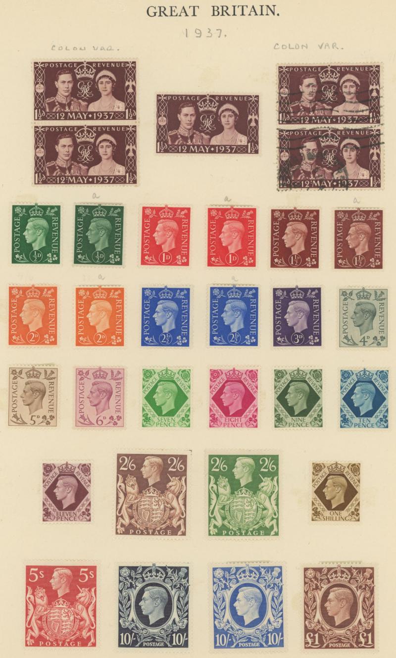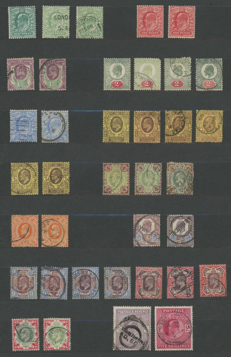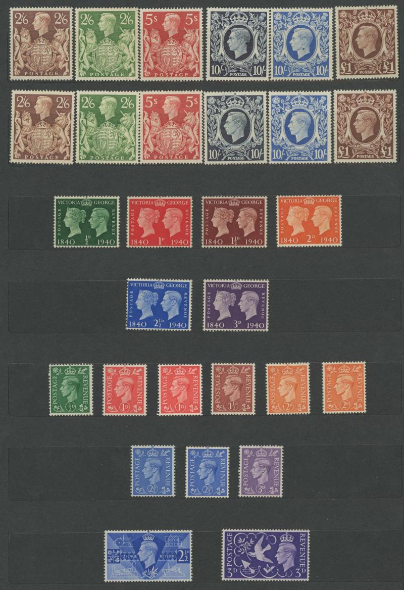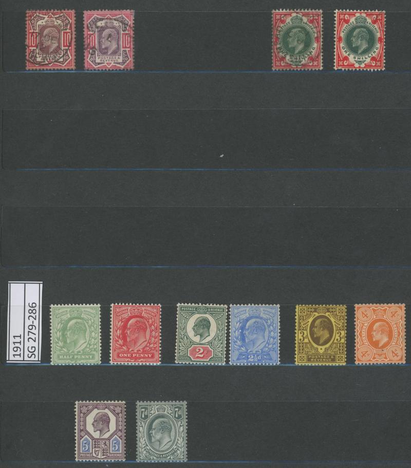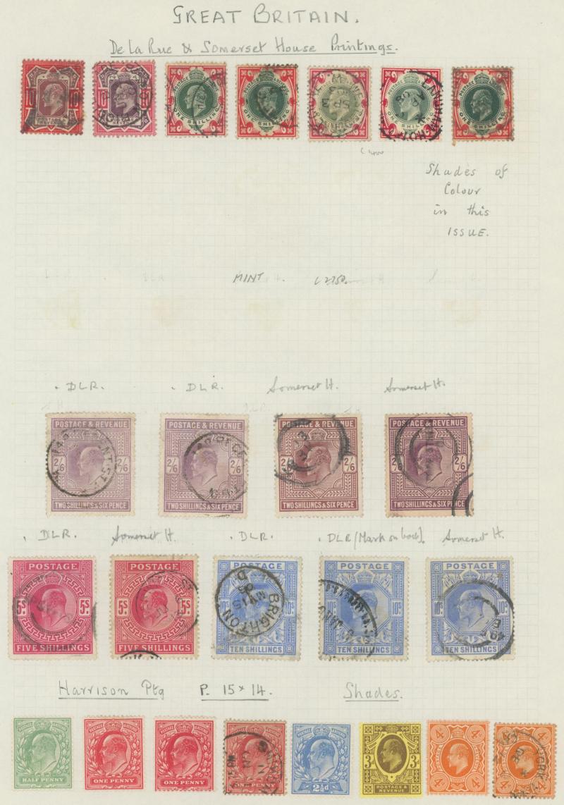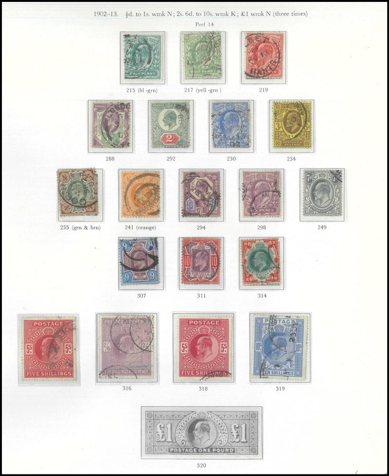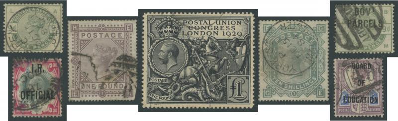 the Surface-Printed issues to 2/- except the 2/- brown with many very fine, 1867-83 5/- 10/- & £1 all presentable, KEVII to 10/-, Seahorses Bradbury Wilkinson 10/-, Wembley & PUC sets (the £1 with bogus steel cancel), QEII issues very fine/CTO with