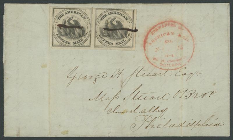1844 large-part entire letter to Philadelphia with American Letter Mail Co No Value Indicated Eagle stamp Scott 5L2 horizontal pair