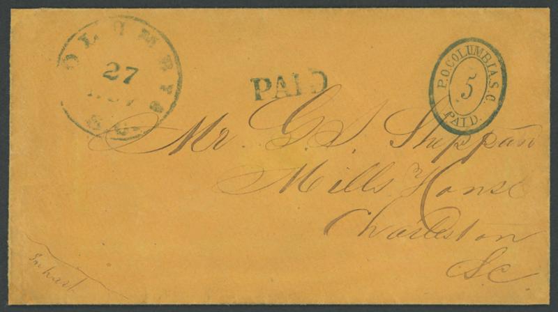 with superb strike of vertical-oval 'PO COLUMBIA SC/ 5 /PAID' postmaster's provisional handstamp in blue Scott 18XU1 with largely fine 'COLUMBIA/27/NOV/SC' cds at upper-left & 'PAID' handstamp both in the same blue ink. Stunning. Ex Alfred Caspary.