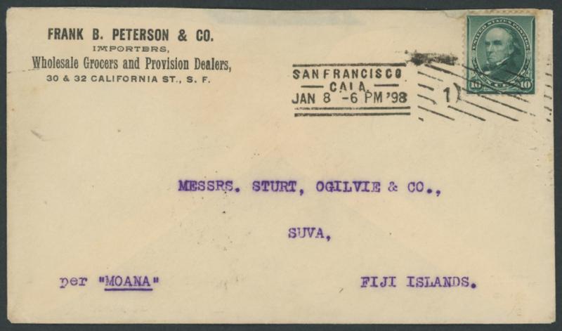 1898 (Jan 8) Frank B Peterson & Co Wholesale Grocers double-rate envelope to Fiji "Per Moana" with Baby Banknotes Webster 10c green
