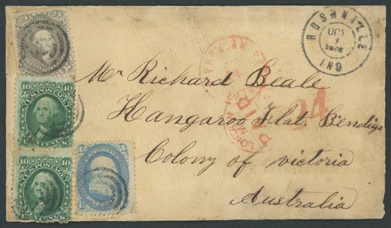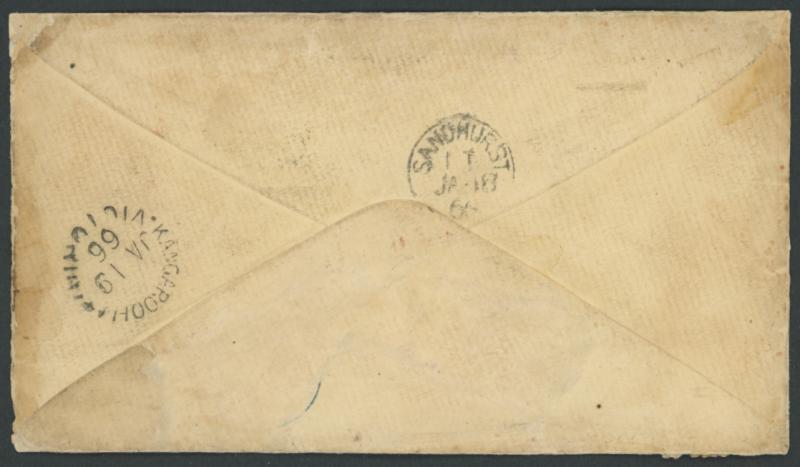 Britain and 'LONDON/PAID' alongside, Sandhurst 'JA 18/66' transit and largely very fine 'KANGAROO FLAT/JA19/66/VICTORIA' arrival backstamp, professionally restored. Ex John Barwis. The rate was 45c for a ship letter over ½oz up to 1oz via Marseilles.