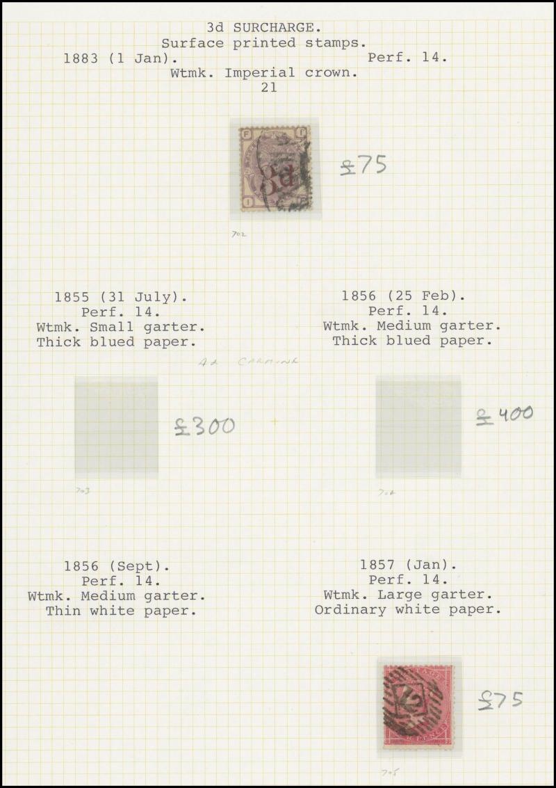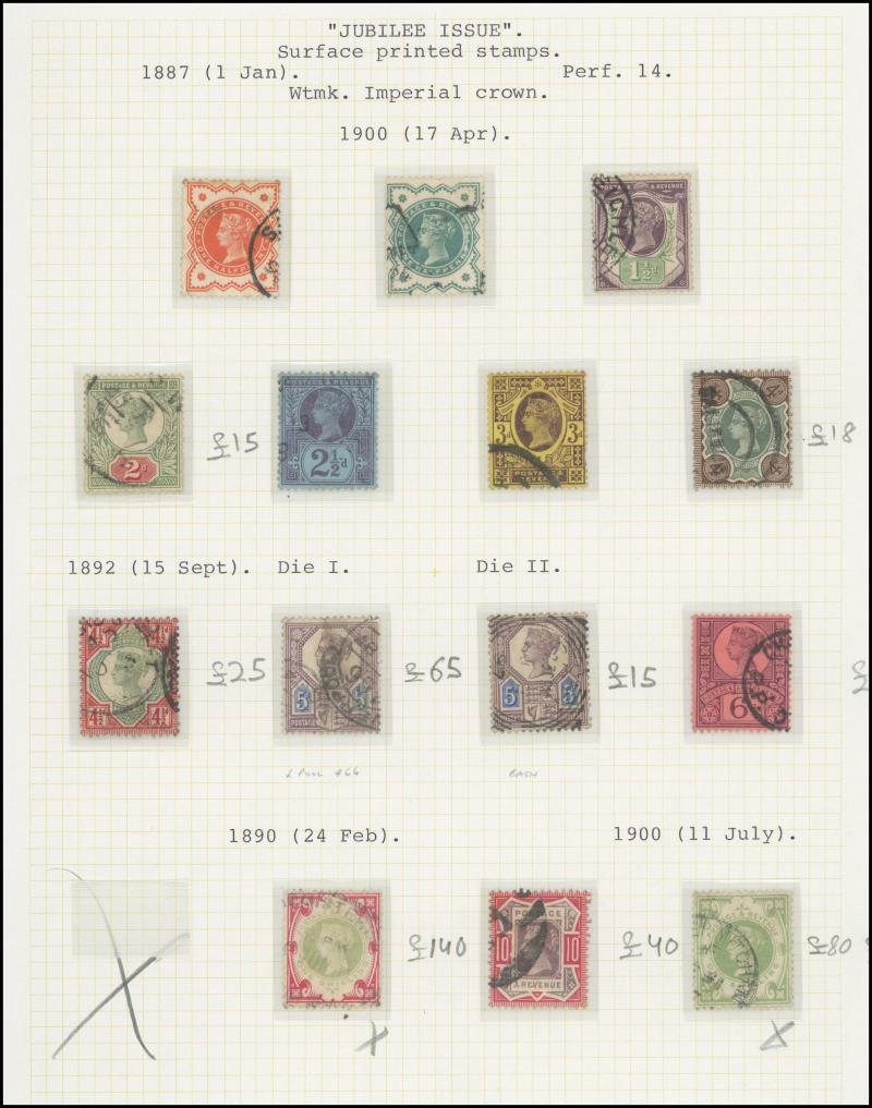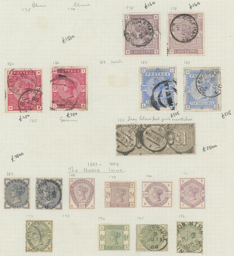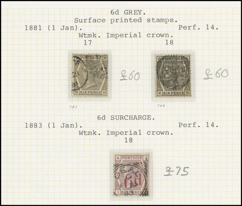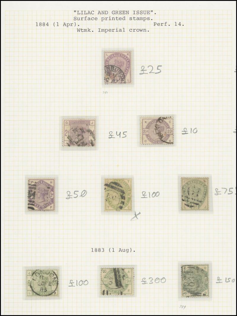 '6d' on 6d lilac *, 1883-84 2/6d Blued Paper used & 10/- White Paper x2 used, 1884 £1 brown Crowns Wmk 'SPECIMEN' overprint (tiny gum thin) & 1888 £1 Orbs Wmk used, 1883-84 Lilacs & Greens 1½d, 2d, 2½d, 3d & 6d *, KEVII mostly used range to 10/- x3,