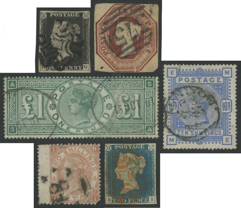 QV to KGV very fine to superb used group including QV Penny Black (just touched at upper-right), Embossed 1/-, 9d straw, 1/- pale