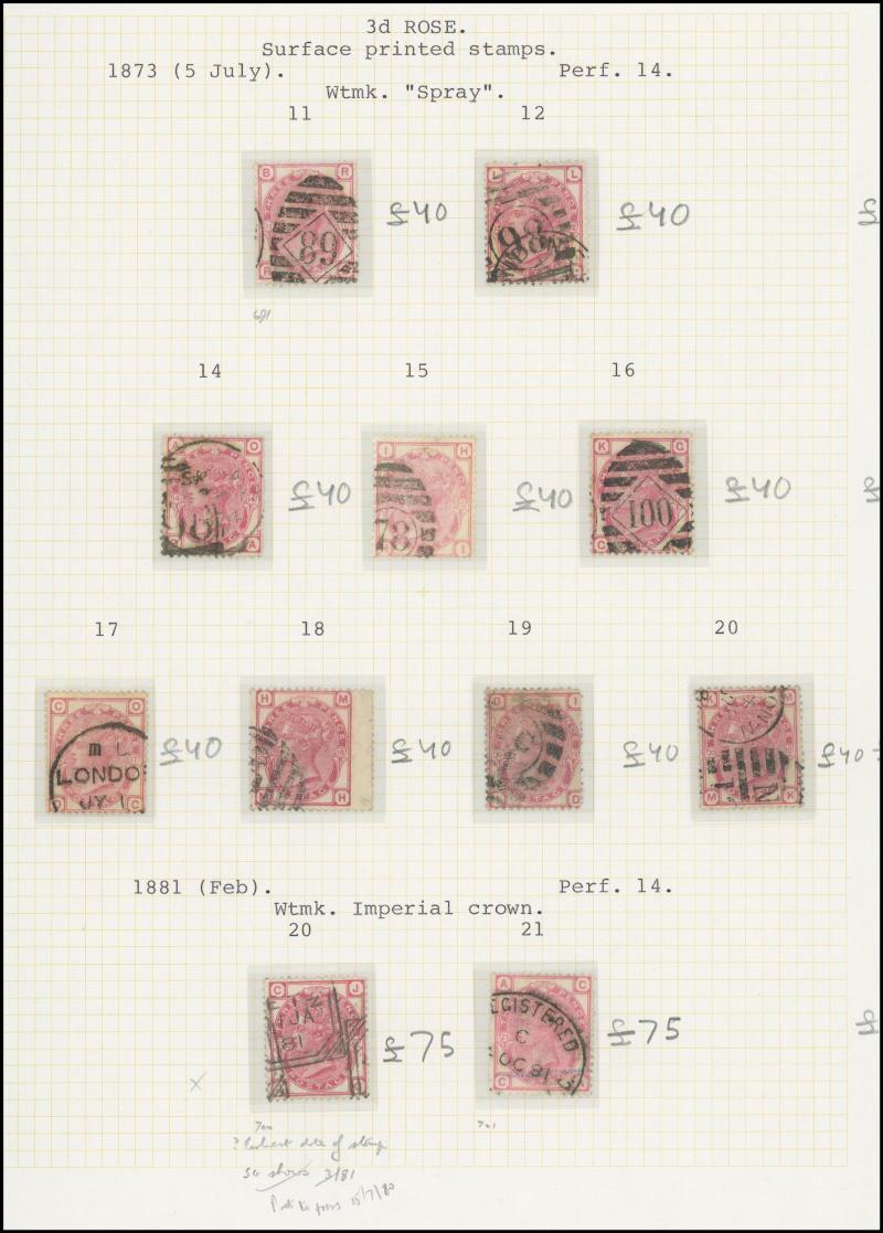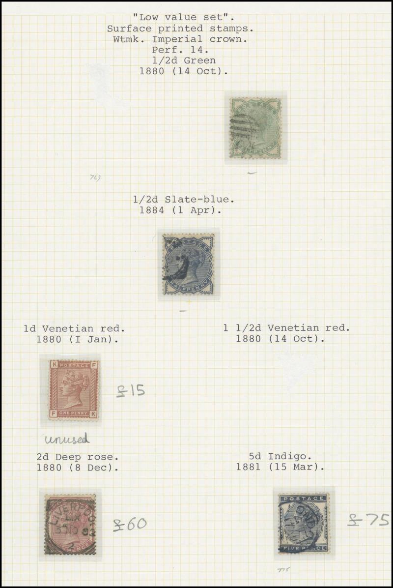 stated to be unused plus Large Crown Wmk Perf 16 used, 1847-54 Embossed 6d x2, 10d & 1/- x3, 1870 1½d rose-red unused, then a range of Surface-Printed including 1867-83 8d orange * x2 & 5/- rose 'SPECIMEN' overprint, 1881 2d rose & 5d indigo *, 1883