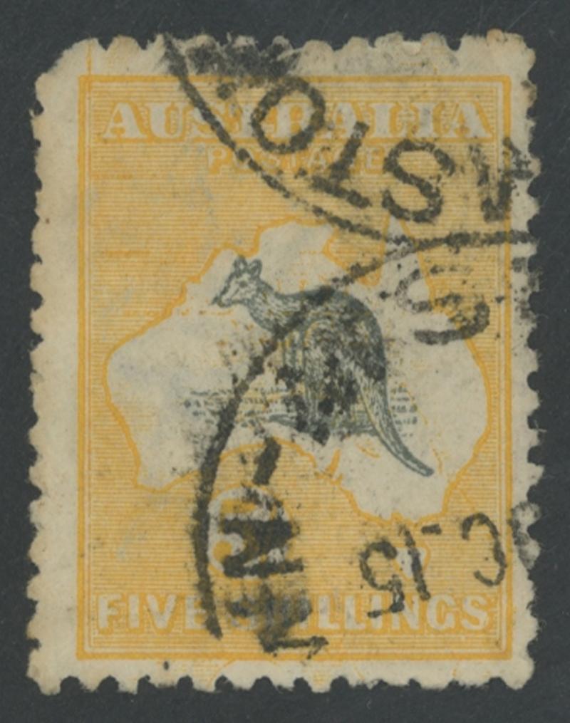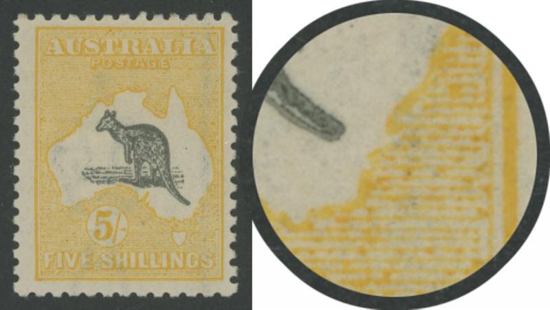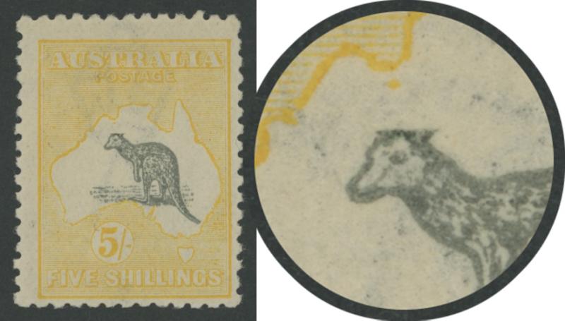 5/- grey & pale yellow SG 42b with Vignette Plate variety Kangaroo's Ears Missing ACSC 44(V)n, very lightly mounted if at all, Cat