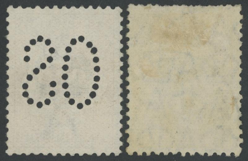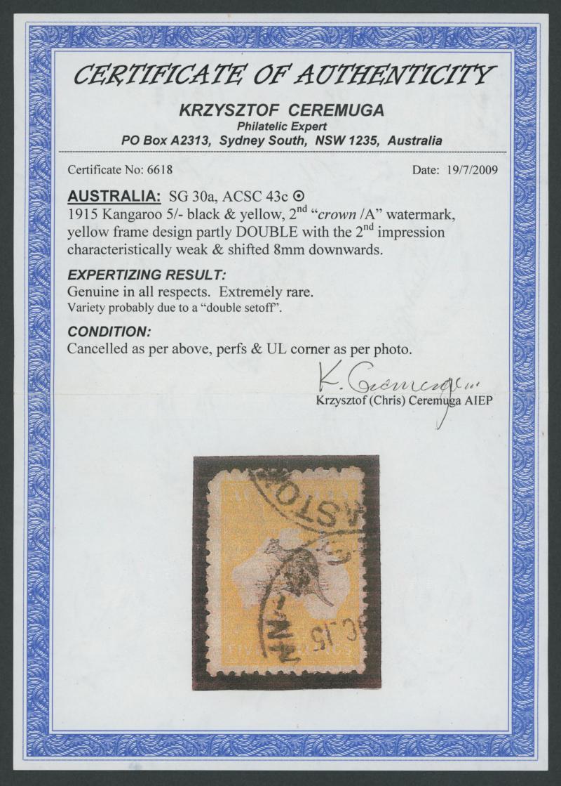 corner at upper-left & characteristic rough perfs, 'GRAHAMSTOWN/OC15/NSW' cds cancels, Cat $9000 (£4500). Chris Ceremuga Certificate (2009) states "the second impression characteristically weak". The lot also includes 5d chestnut punctured Large 'OS'