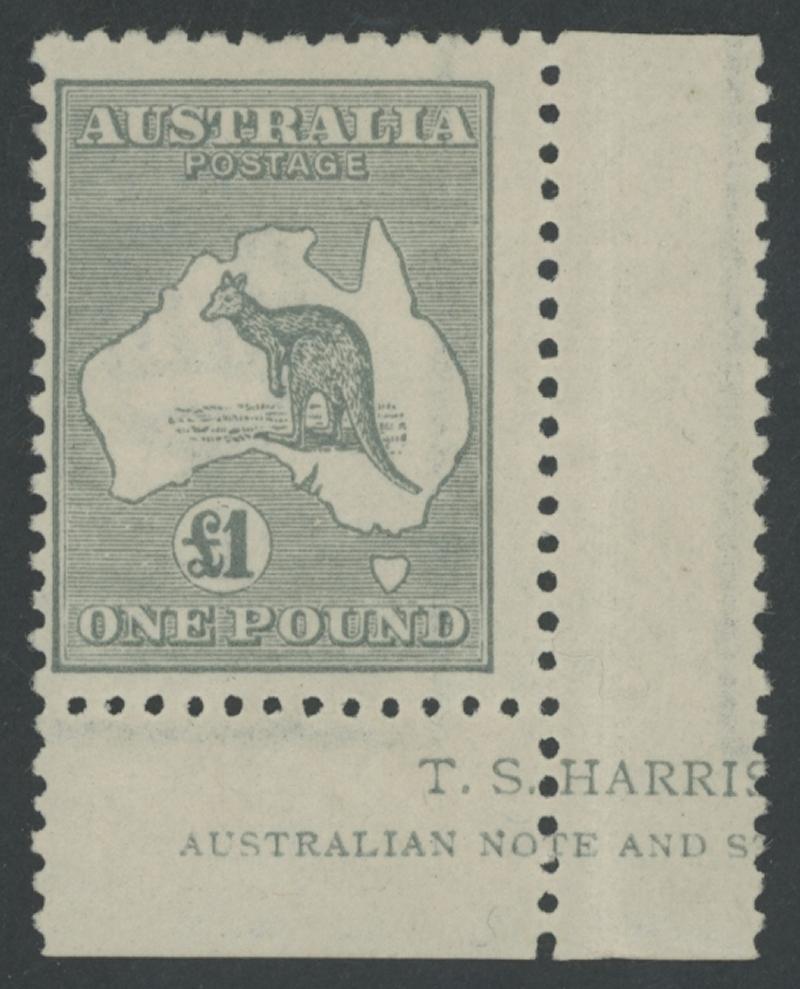 £1 grey SG 75 from the lower-right of the left-hand pane with large-part 'T.S. HARRIS[ON]/AUSTRALIAN STAMP AND N[OTE PRINTER]'
