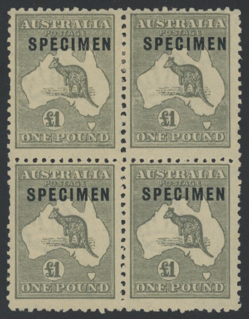 £1 grey SG 75 with Type C 'SPECIMEN' Overprint block of 4 ACSC 53xc, some short perfs at left, the gum a bit aged with hinge